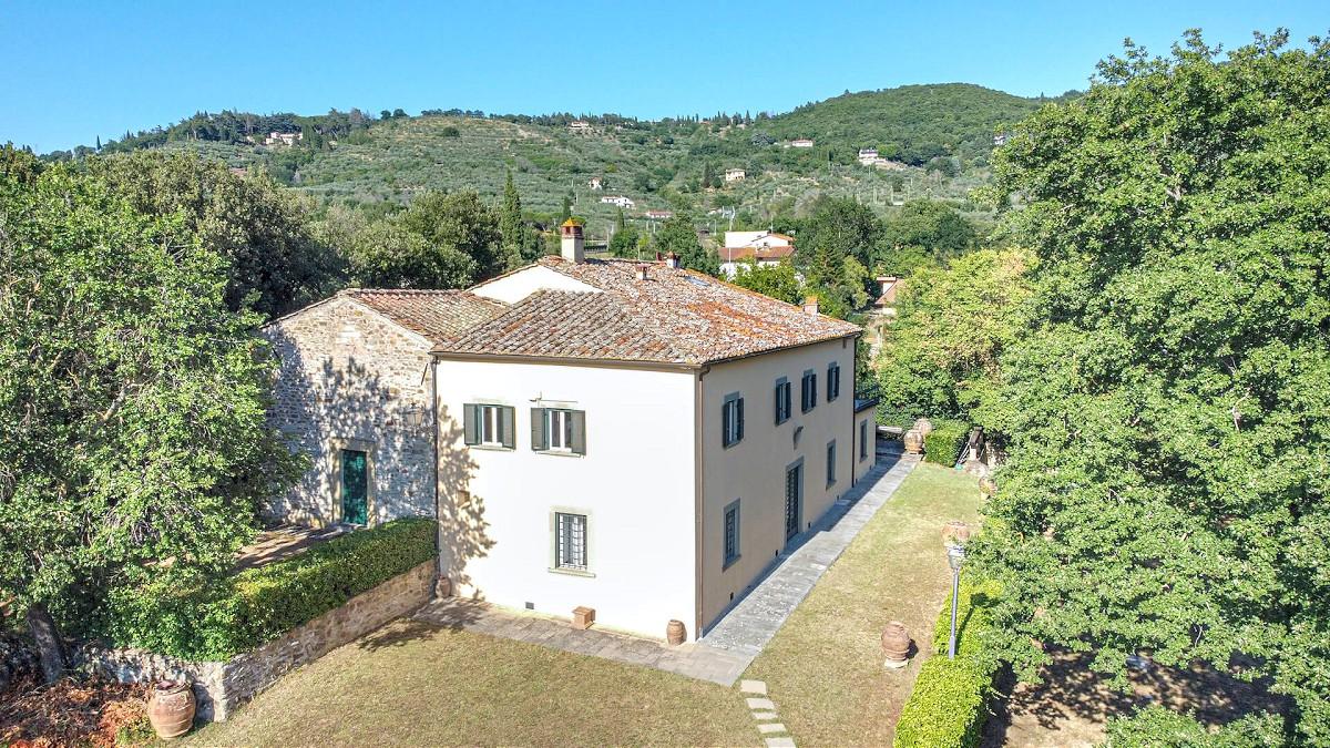 The villa is surrounded by greenery and showcases a traditional elegance with authentic characteristics like terracotta flooring, wooden-beamed ceilings and rustic wooden features.