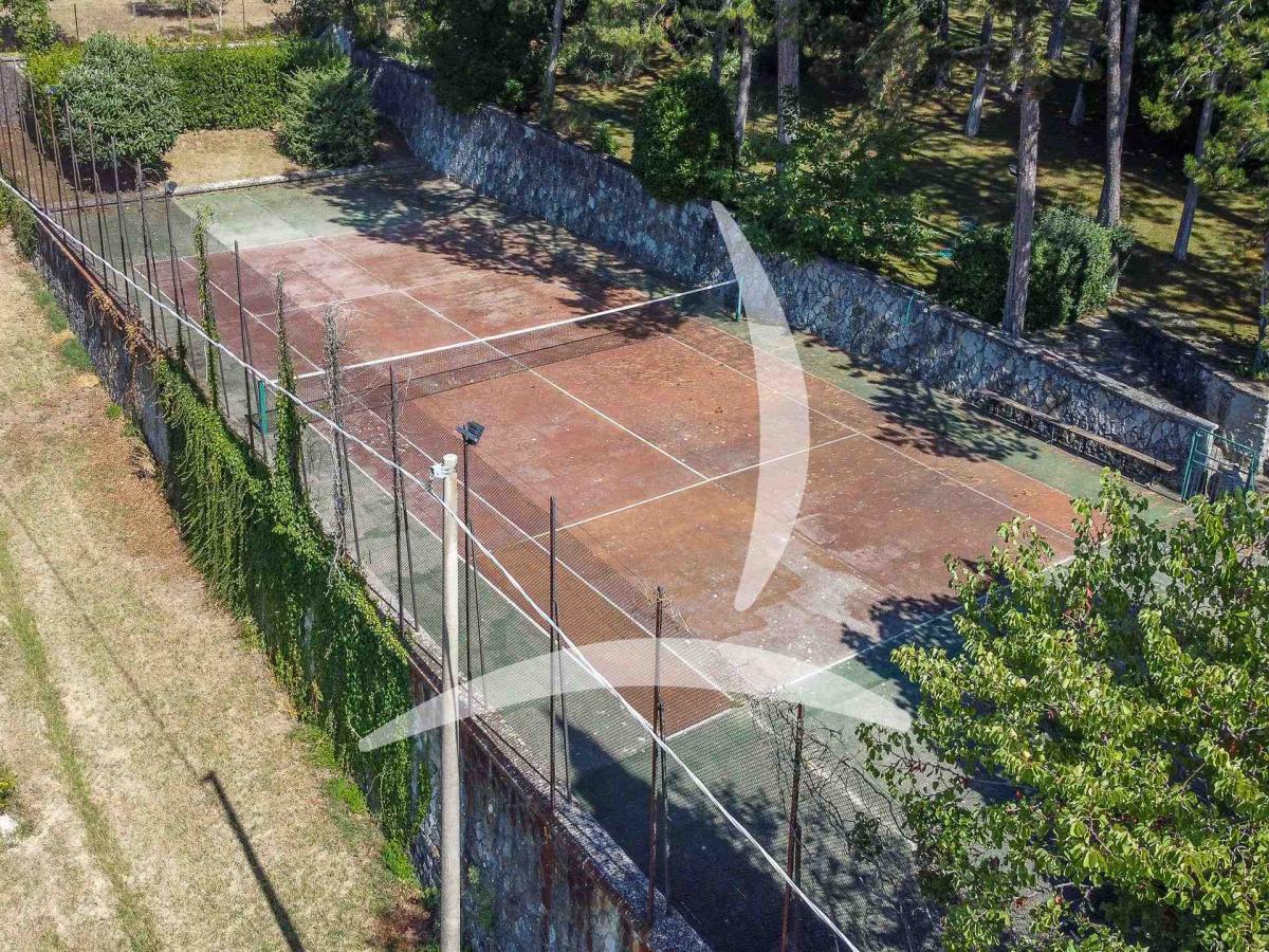 The property includes 1 hectare of fenced land with a manicured garden, fountain, equipped swimming pool, tennis court, lemon house, and wooded areas with pine trees. These outdoor spaces provide an exclusive setting perfect for relaxation or hosting events.
