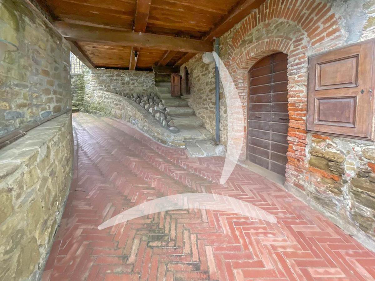 The ground floor features a stunning panoramic veranda, perfect for relaxing and enjoying the city's skyline. The spacious living room is highlighted by a rare, original 13th-century fireplace that adds a unique historical charm, while the kitchen is functional and ideal for entertaining.