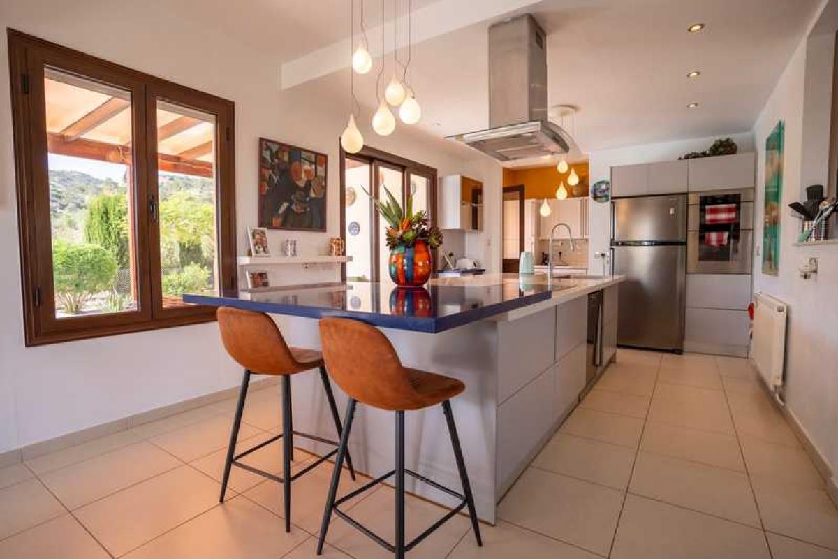*Open plan lounge/dining room and kitchen with doors from the lounge leading to the pool and garden, the kitchen is very modern with a large marble island, there is a log burner in the lounge