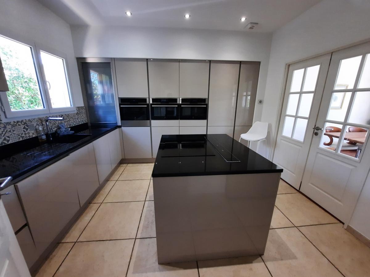 - Ground floor: Entrance hall of 12.5 m2, WC with handbasin, living room of 43.7 m2 with fireplace and leading to the terrace and pool, equipped kitchen with high quality appliances of 13 m2 (upper and lower units, 3 oven one combined with micro-wave, hob, retractable fan, dish washer, American fridge), pantry/laundry room of 7.2 m2, en suite bedroom of 16 m2 with washroom of 4.7 m2 (Italian walk-in shower, 2 washbasins, WC) and dressing room of 3.6 m2, office of 21 m2.