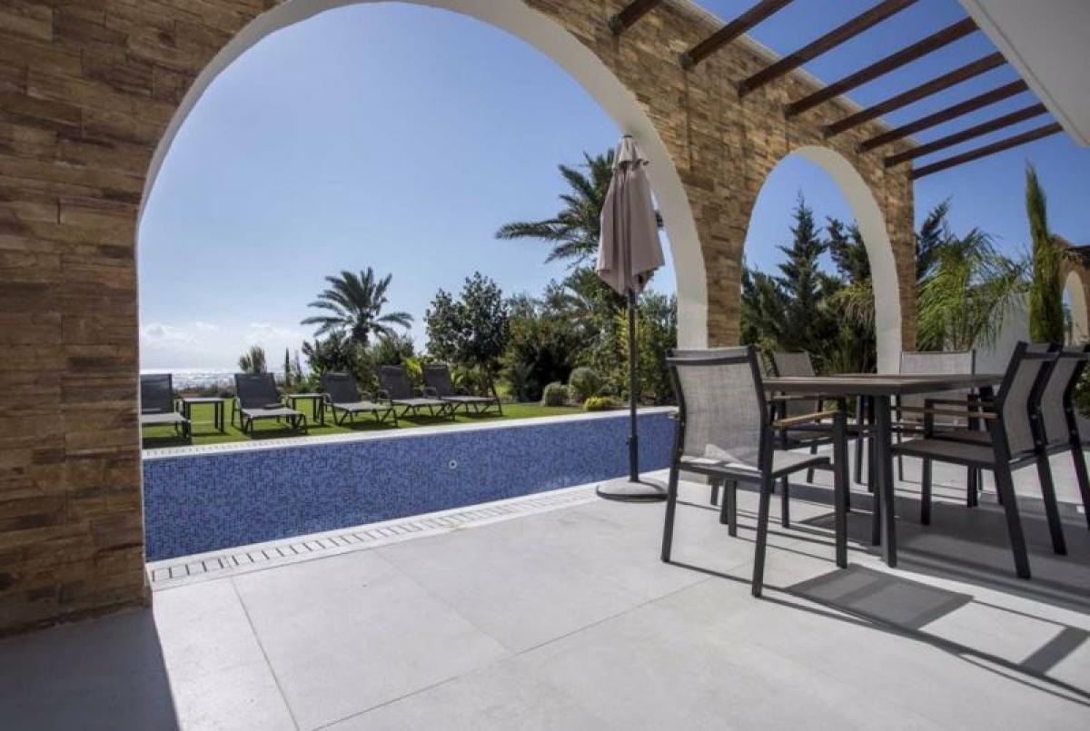 Located in a peaceful private community on the seashore west of Ayia Napa, this beautiful frontline villa has an expansive lush garden plot and sea views. Intelligently designed to mirror traditional architecture while bringing full modern amenities, the villa has large interior and exterior living areas, bright bedrooms with sea views, and a private pool in a garden and green area directly to the sea. The villa is sold fully furnished with appliances.