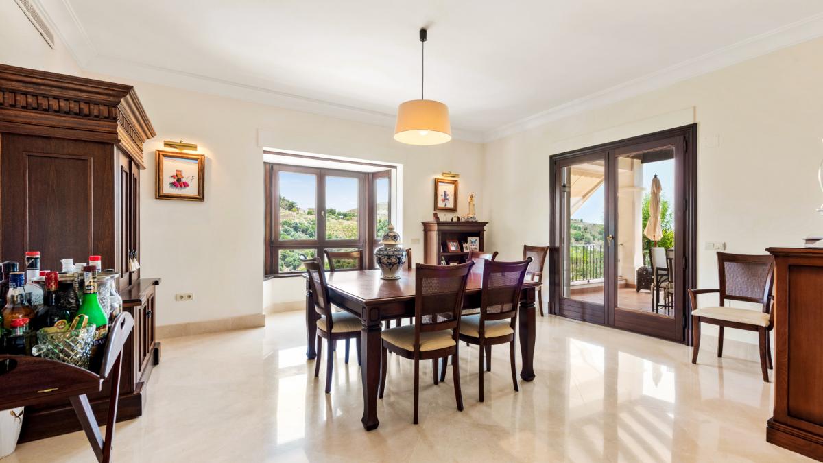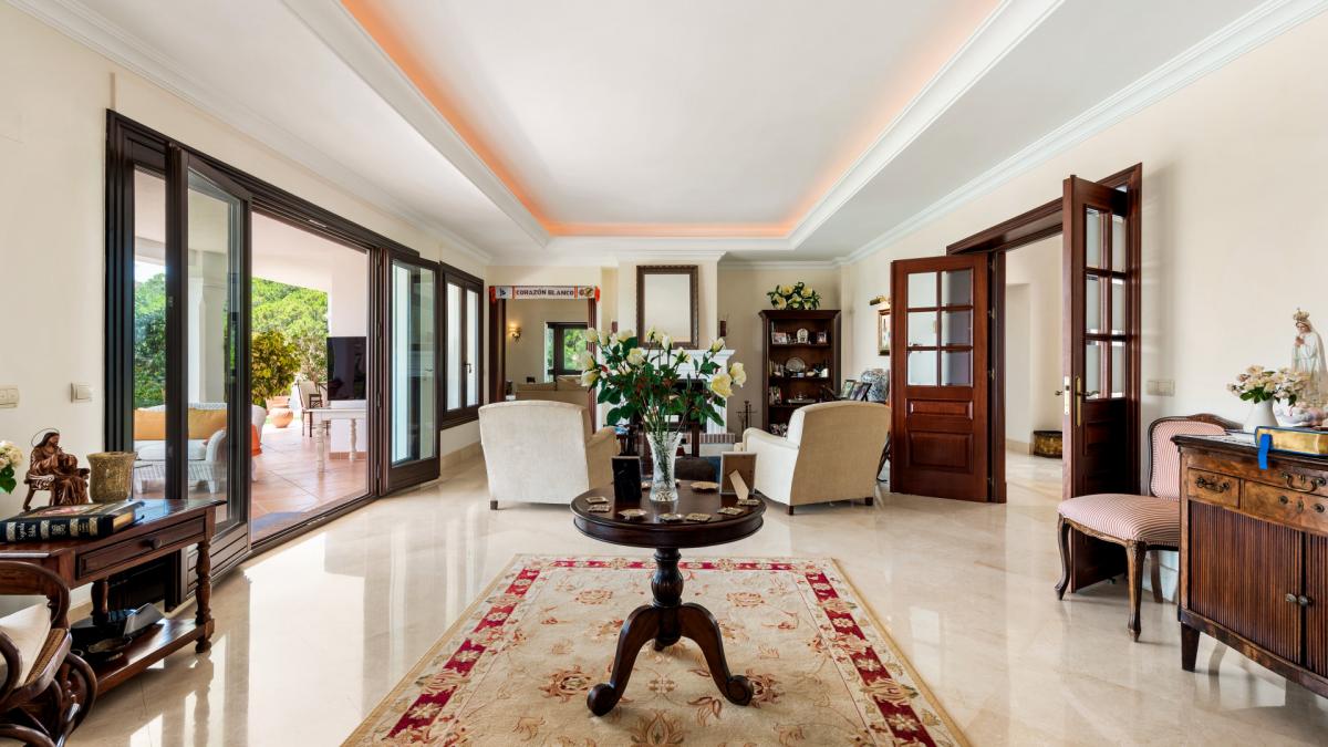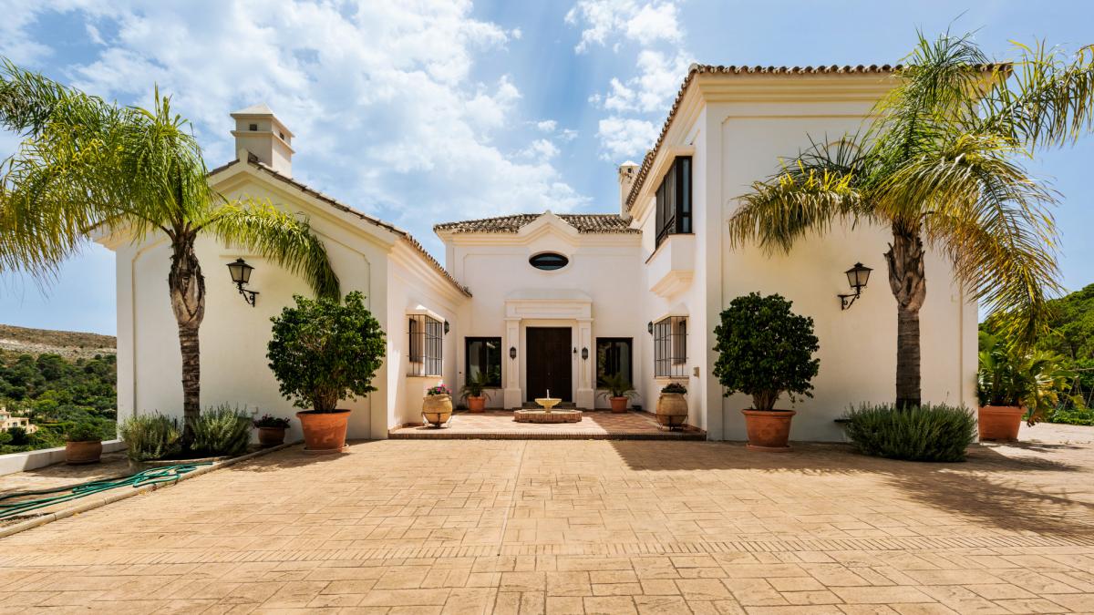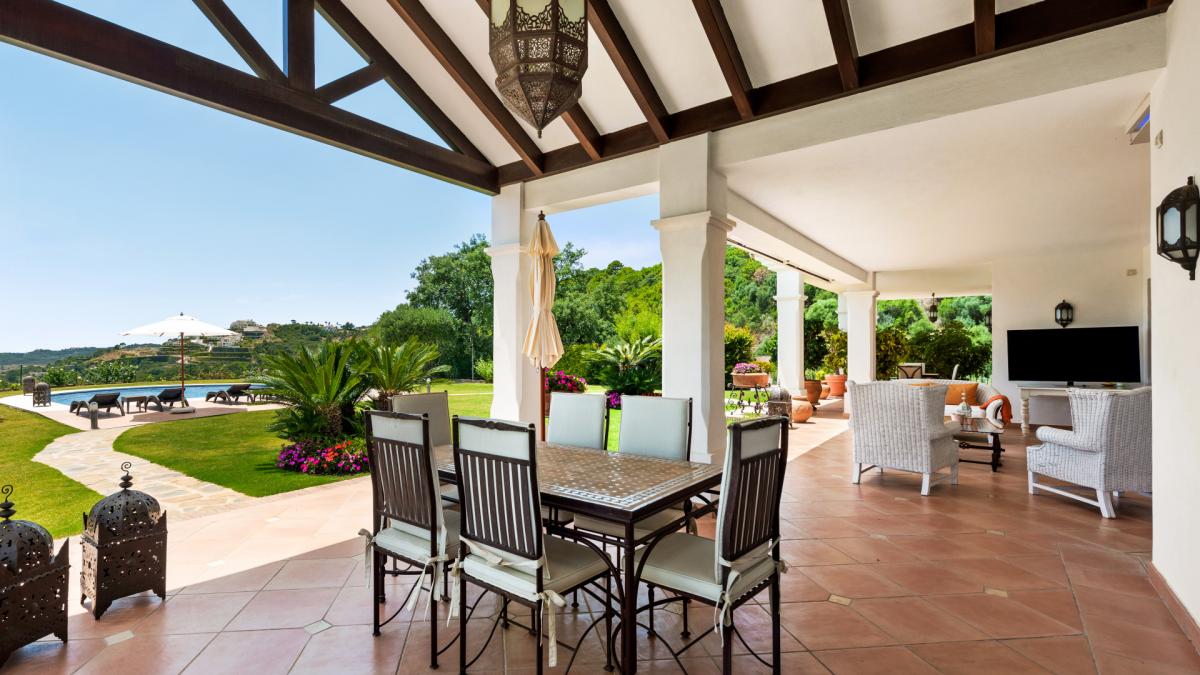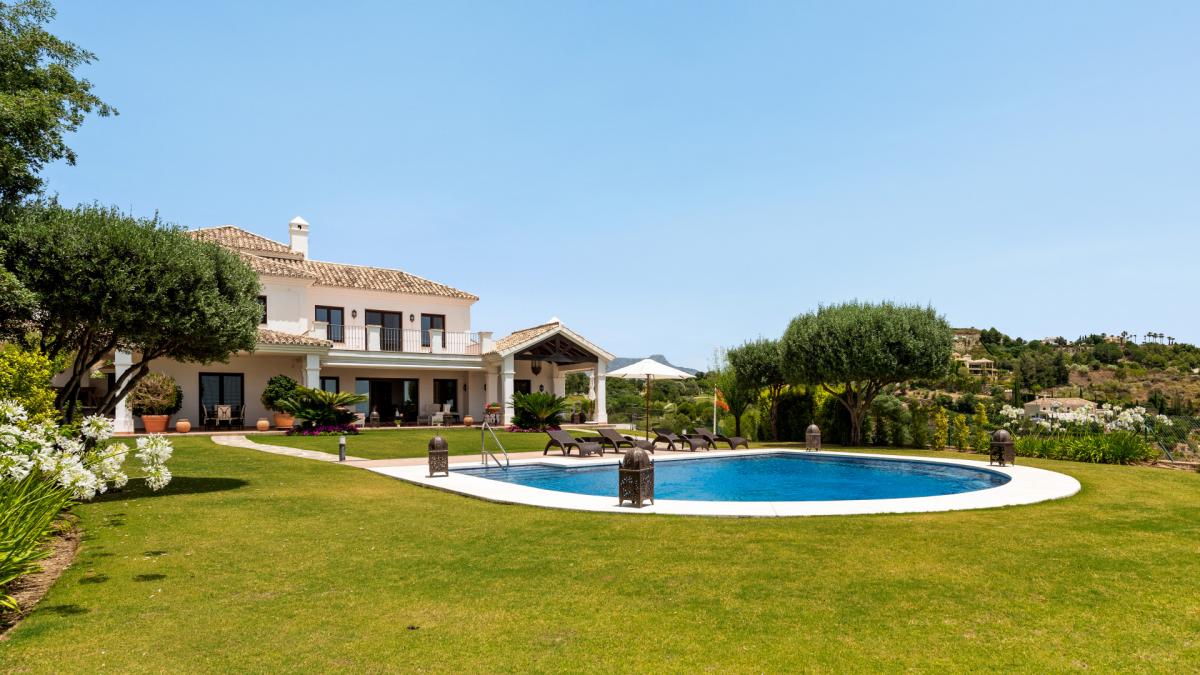 This stunning luxury villa is ideally located inside the highly exclusive Marbella Club Golf Resort in Benahavis, benefitting from an elevated position within the community that affords the home with spectacular sea, golf, and mountain views. immaculately presented in a timeless Mediterranean style, the spacious villa was built in 2008 to the highest quality specifications. From street level, an automated gate opens to the driveway which leads directly to the enclosed garage on the lower level, or alternatively straight up to the main entrance of the house located on the first floor where there is additional outdoor parking. Once inside, an entry hall leads to all the quarters within and hints at the high levels of quality that can be found in every part of the villa. Straight ahead through the double doors is the living room from where the sea views immediately impress, views that carry on to the adjacent dining room that also opens to the covered terrace and garden directly outside. Further in on this level is the superb chef's kitchen with beamed ceiling that features beautiful far-reaching sea and mountain views over the surrounding areas, stretching all the way to Marbella's iconic La Concha mountain. There is an additional TV/sitting room to the right of the living room that also opens to the garden and adds to the sensation of ample space inside the home. Completing this level of the villa is an en-suite guest room with garden views. Upstairs there are two additional bedrooms, including the lovely master suite that boasts a private terrace with sea views that overlook the garden, a beautiful luxury bathroom, and a dressing area. The lower level of the villa is comprised of two more bedrooms and extra living space waiting for new owners to make it their own. This includes a separate studio apartment, laundry facilities, machines room, and interior access to the enclosed garage. The home is completely surrounded by a neatly landscaped garden that features open lawns and mature trees of various types and is designed to make the most of the mild climate of the Costa del Sol. There are several covered and open spaces that are perfect for outdoor dining or for simply relaxing around the pool area while enjoying the views and taking the sun. Being inside the golf resort, the property benefits from the highest levels of 24-h manned security. Owners have access to the sporting facilities in the resort including the private 18-hole golf course and clubhouse, as well as the equestrian facilities of the community. By car, the beaches of Estepona's New Golden Mile are 10 minutes away, and just 15 minutes to Marbella or Estepona town centres, while the Malaga airport can be reached in 1 hour.