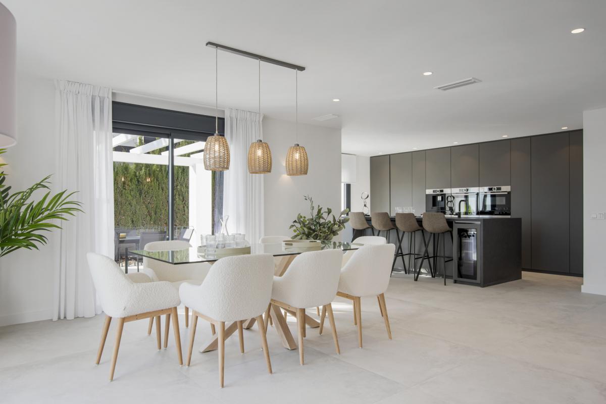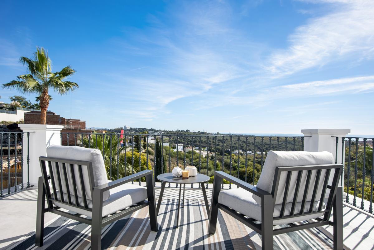 Situated within the exclusive community of Los Flamingos Golf resort, this meticulously and recently renovated luxury villa showcases sophistication and comfort. Boasting 5 bedrooms and 5 bathrooms, this exquisite property is a testament to modern design and panoramic vistas of the sea and mountains.Spanning three levels, each offering captivating sea views, the villa invites you into a realm of luxury living on the coast. Upon arrival, a driveway guides you to the rear of the villa, where ample parking awaits. Step inside to discover the ground floor, featuring a state-of-the-art designer kitchen, an en-suite bedroom, and a spacious living area leading seamlessly to the covered terrace, overlooking the inviting pool below.Ascending to the upper level reveals two luxurious bedroom suites, including the lavish master retreat with its own private terrace, offering breathtaking sea views that stretch into the horizon.Descending to the pool level, you'll find two additional bedroom suites, alongside a home cinema and games room, both offering direct access to the landscaped garden and pool area. Outside, the manicured garden envelops the property, with mature trees providing a serene backdrop. The expansive pool area offers ample space for lounging and soaking up the year-round sunshine of the Costa del Sol.Being within the secure community of Los Flamingos, residents benefit from 24-hour gated security, ensuring peace of mind at all times. The prime location places you just minutes away from the pristine sandy beaches of the New Golden Mile, with Estepona center a mere 10-minute drive. The vibrant city of Marbella is easily accessible within 15 minutes, while Malaga airport is conveniently located just an hour away.