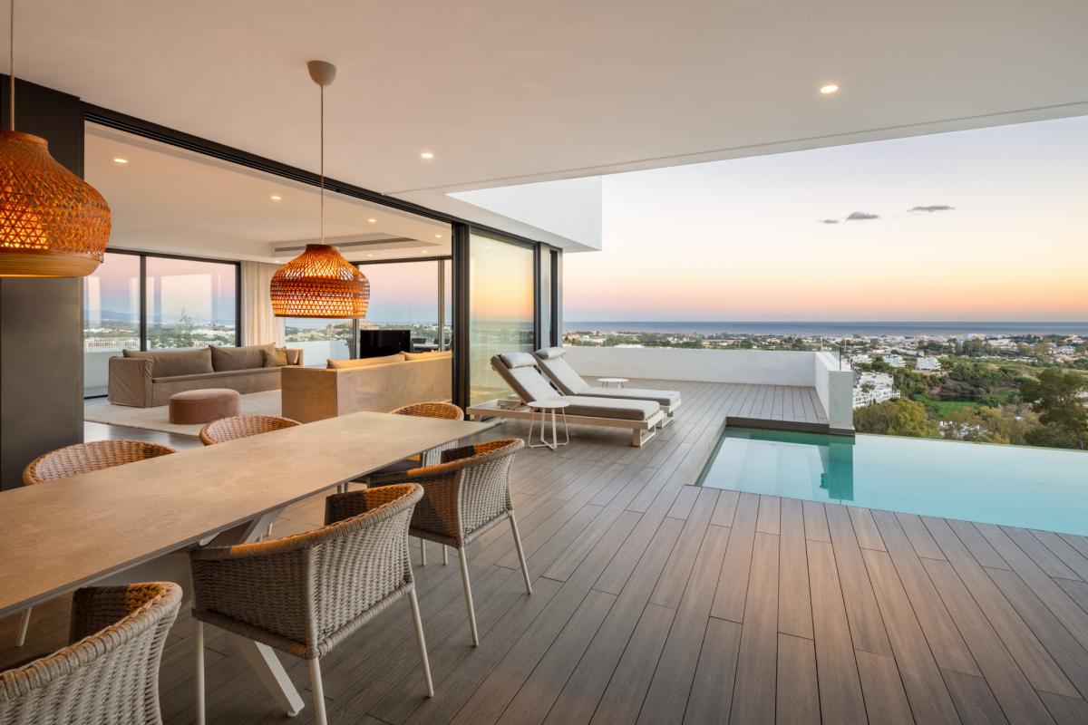 Located in a privileged position within the exclusive gated community of El Herrojo Alto in La Quinta, this modern villa stands out for its contemporary design and exceptional location. Due to its elevated position, the property enjoys stunning panoramic sea views from all levels, as well as full views of the coastline, extending all the way to Gibraltar and the African coast. The interior of the villa features an open-plan layout that allows for a seamless flow between the different living areas, while the terrace is also very spacious and includes a private pool, perfect for year-round enjoyment, as well as lounge areas and an al-fresco dining space.The modern kitchen is fully equipped with state-of-the-art appliances and offers ample storage space, combining both functionality and elegance. Floor-to-ceiling glass sliding doors open the interior to the exterior terraces, maximizing the indoor-outdoor living experience and allowing for breathtaking views from every corner of the house.The villa offers four generously sized bedrooms, with the master bedroom being the real highlight, offering unparalleled views that can be enjoyed from the private terrace connected to the room. Every corner of this villa is designed to offer maximum comfort and elegance. Additionally, residents can enjoy an entertainment room featuring a cinema/lounge area and a billiards table, perfect for gatherings and leisure time.El Herrojo Alto, the community where this villa is located, is a secure gated community with 24-hour security, ensuring peace and privacy. its location allows for easy access to nearby amenities and is perfectly connected to popular areas such as Nueva Andaluca, the village of Benahavs, San Pedro de Alcntara, and Puerto Bans, where you can enjoy restaurants, shops, and leisure activities.
