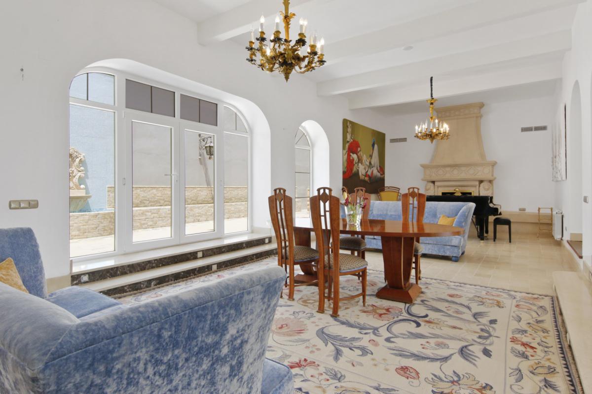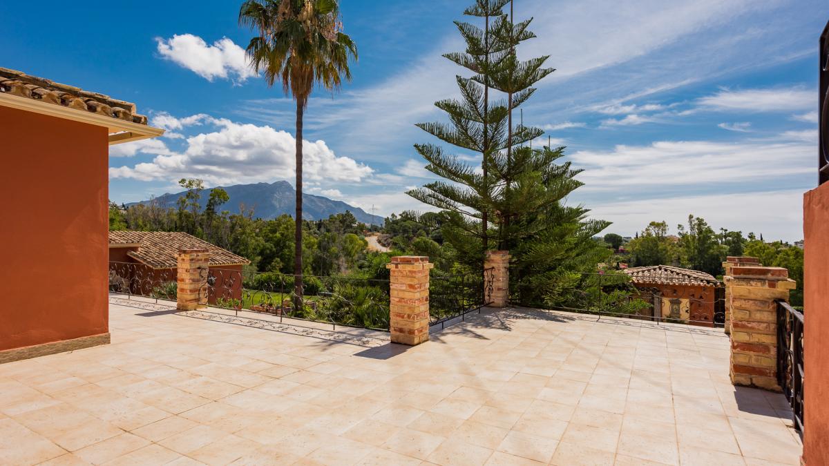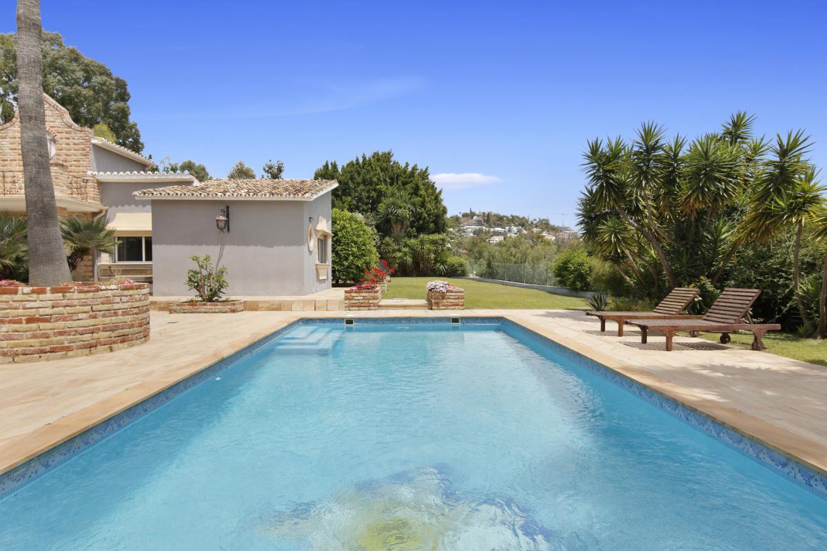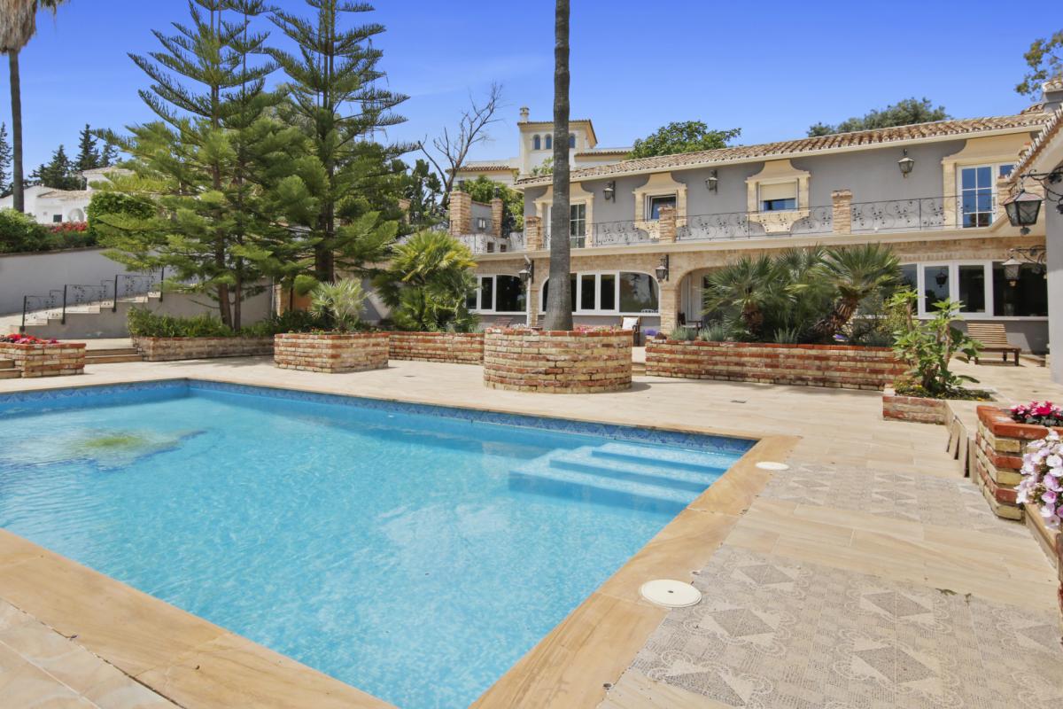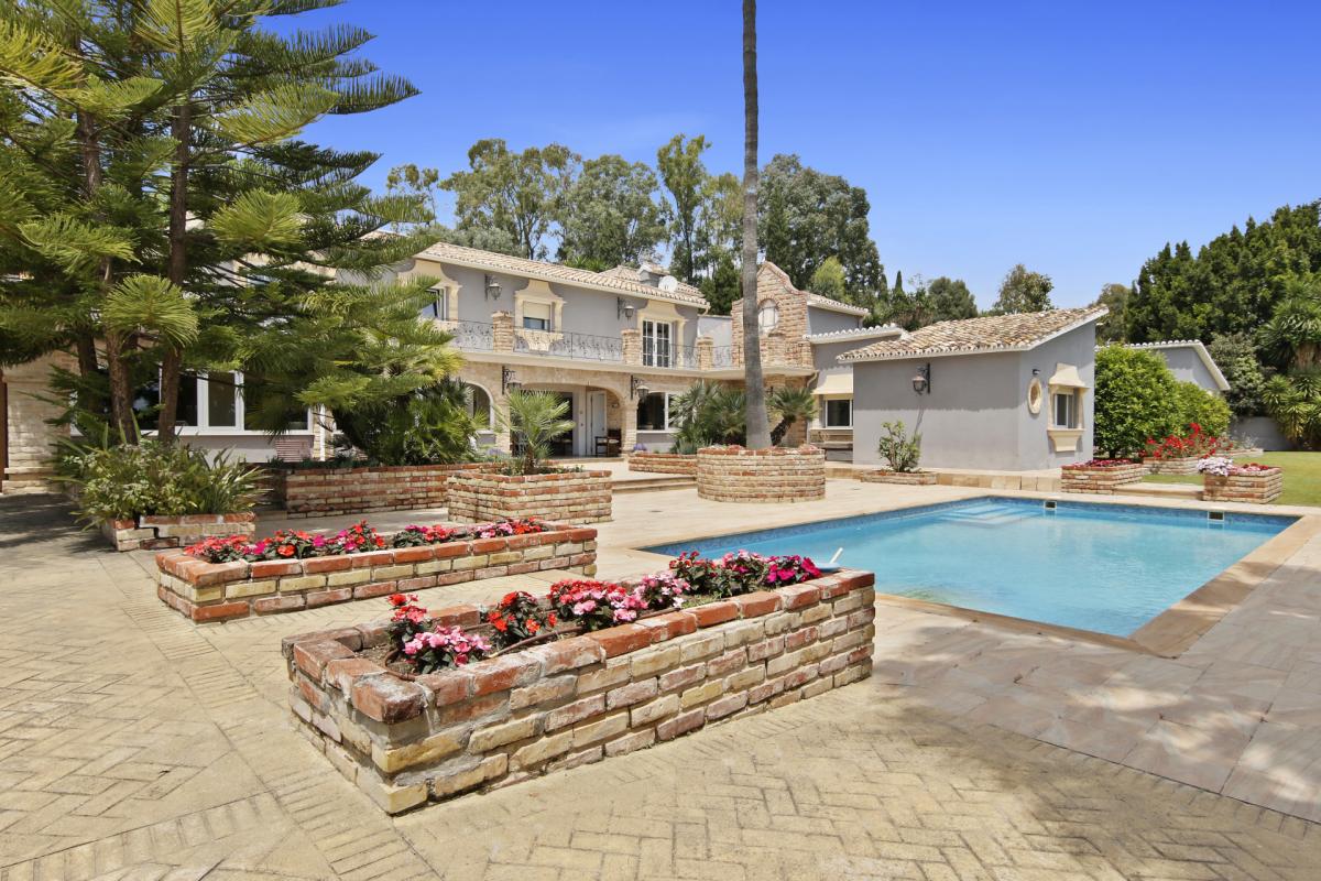 A beautiful family home offered for sale situated minutes from international schools and the amenities of San Pedro. Recently reformed to a very high standard including central heating and air conditioning throughout. A private drive leads to the property with parking for several cars and a 2 car garage. On the ground floor of the property is situated a very large fully fitted kitchen with walk-in pantry, breakfast area and adjoining covered breakfast / dining terrace; a large living room with fireplace and views to the garden and internal patio; 3 very large bedrooms with en suite bedrooms, guest toilet and a large area by the kitchen housing a sauna, steam room, jacuzzi and shower and toilet. This area could also be used as a playroom or cinema room, for example. On the upper floor is situated the master bedroom with two dressing areas and his and her bathrooms and views across the garden towards La Quinta. The garden has a large pool, a good-sized area of flat lawn plus a self-contained staff/guest cottage with a bedroom, bathroom and kitchen.A peaceful retreat in perfect condition yet minutes from amenities and providing convenient access to the airport and Marbella. Fuente del Espanto is a small community of villas located on the road to Ronda below El Madroal.