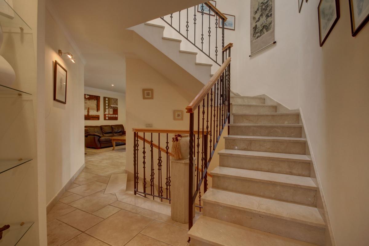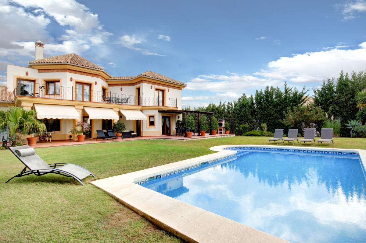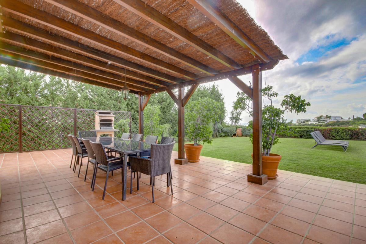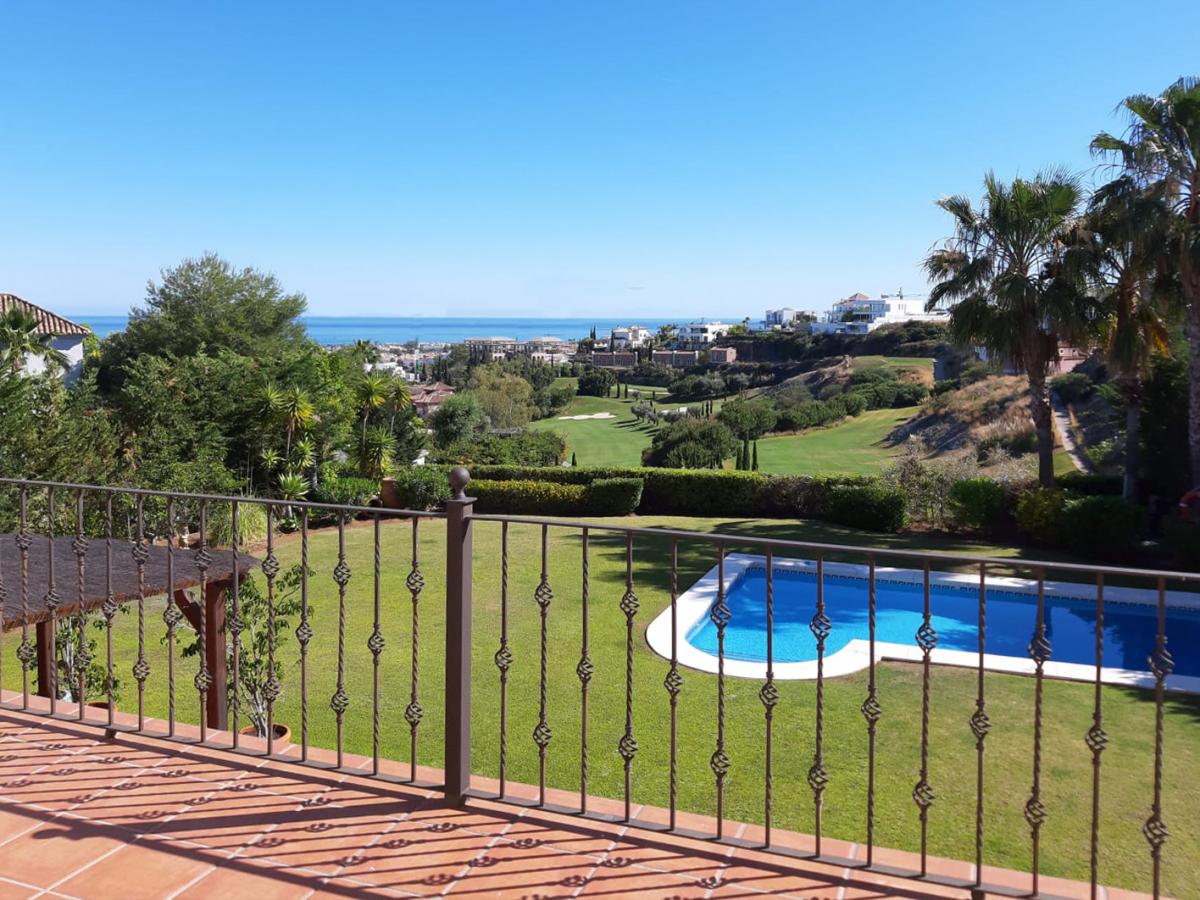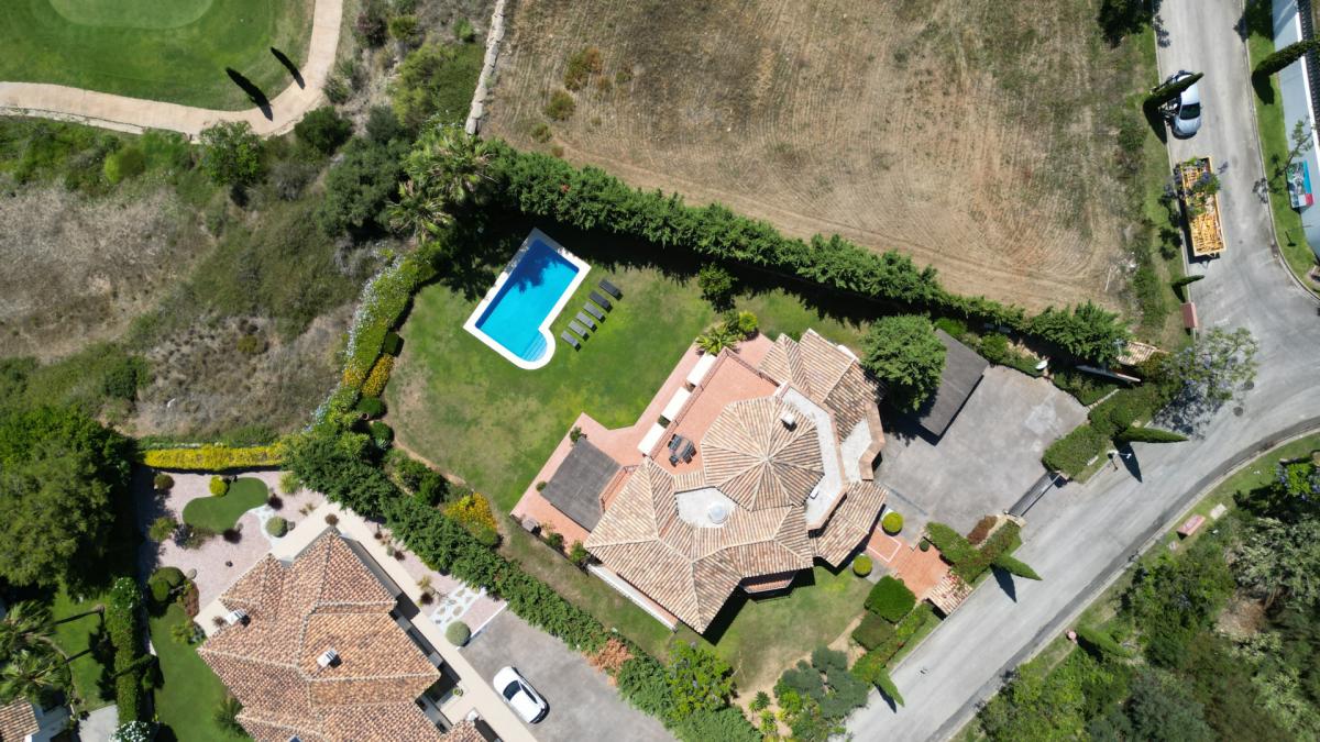 This wonderful villa is located in a spectacular corner of its community, in an elevated front line golf position that ensures views of the sea and golf course from the home. The villa showcases a beautiful blend of the classic and timeless Mediterranean exterior with modern design elements throughout, resulting in a home of exceptional beauty and comfort. Arriving at the home there is an automated gate that allows for vehicles to enter the property, arriving directly at a covered carport with room for 2 cars and more space in the driveway, while a secondary pedestrian entrance leads directly to the front door. Entering the house on the main level, there is an entry hall that leads into a spacious living room and further to the covered terrace and garden. Across from the living room is the formal dining room with garden views. To the left of the entrance, a hallway leads to the kitchen which is totally equipped with built-in high-end appliances and has an adjacent family dining area that opens to the garden, making this the ideal place for family gatherings and meals. On this level, there are also two bedrooms, one of them currently used as a home office. Upstairs there are three more bedrooms, including the beautiful master suite that boasts vaulted ceilings, a luxury bathroom, and a walk-in dressing room. it accesses a spacious terrace that overlooks the garden and receives impressive sea, golf, and mountain views. The basement level of the villa features more luxury living areas and is comprised of a games room, home cinema, gym, and massage room, as well as an additional bedroom suite with its own private entrance. Surrounding the home is a beautifully landscaped garden that's surrounded by a row of mature trees providing excellent privacy to all areas of the home. The pool is surrounded by ample lawns and there are covered and open areas to dine outdoors and simply relax while enjoying the sun and views. Being located within the world-class Villa Padierna Golf Resort, the home benefits from 24h gated security with manned patrols. The highly exclusive area is dotted with luxury villas and residential complexes in addition to all the facilities offered by the 5-star hotel. By car, the nearest beach is approximately 5 minutes away, and 10 minutes to the centre of Estepona, Puerto Banus or Benahavis. Malaga airport can be reached in under 1 hour.