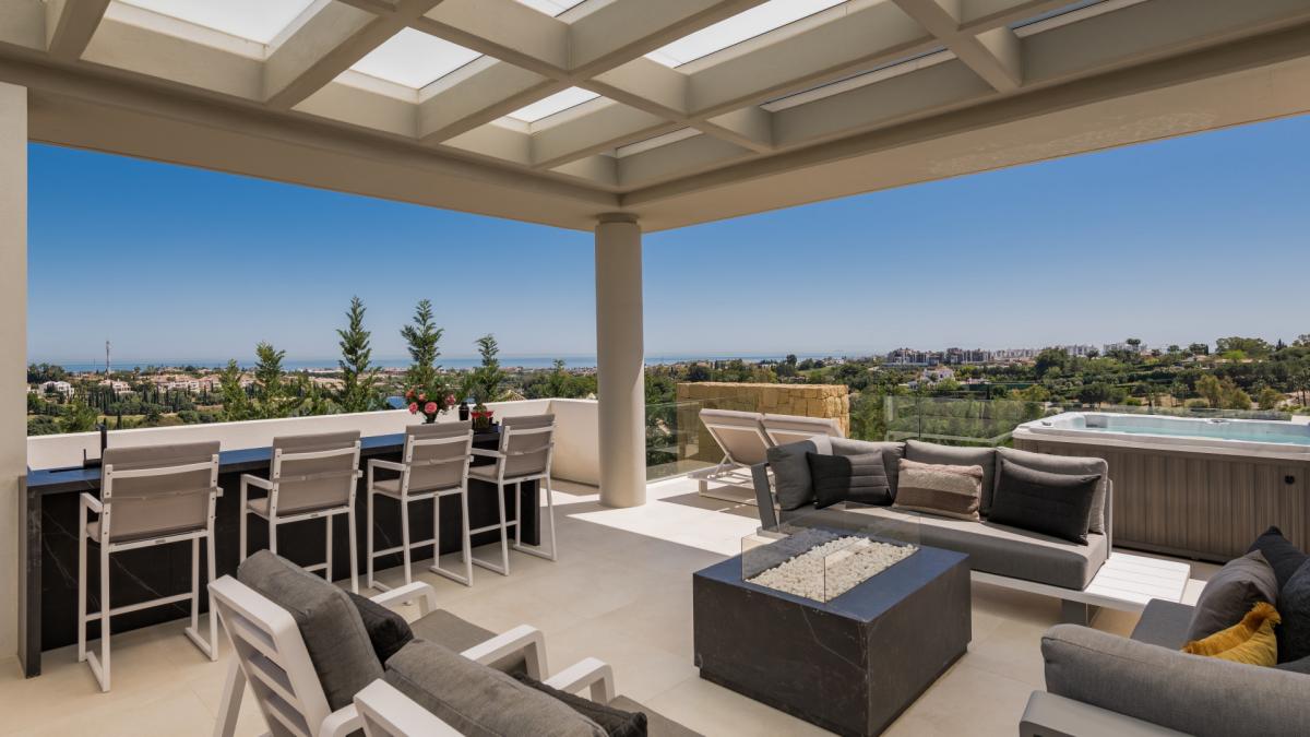 This fully furnished, five-bedroom luxury home is a true hidden jewel within the prestigious Los Flamingos Golf Resort. Spanning three beautifully designed levels, the villa showcases exquisite craftsmanship, thoughtful detail, and high-end finishes throughoutevery space created to elevate comfort, style, and modern living.Entering through the grand vestibule, with guest bathroom and lift, you are welcomed into a spacious open-plan living and dining area featuring a designer Siematic kitchen equipped with Gaggenau appliances. A discreet service entrance provides direct access to the kitchen from the carport for added practicality. in the living area, silent electric pocket windows slide seamlessly into stone-clad walls, opening onto a floating terrace with breathtaking views of the Mediterranean Sea and the golf course. This level also hosts the luxurious principal suite, complete with a private terrace, elegant en-suite bathroom, and fully fitted dressing room.Descending from the main vestibule, the lower level reveals four generous en-suite bedrooms, each with direct access to the beautifully landscaped gardens and infinity pool. This floor also features a fully equipped gym, sauna, wine cellar, cinema room, games area, and hospitality kitchen by Siematic. A closed garage with space for four cars and a dedicated laundry room completes the level.The top floor is home to a stunning private rooftop terrace, your own serene sanctuary featuring an outdoor kitchen, Jacuzzi, firepit, and ample seating, making it the ideal retreat for enjoying magical sunsets and golden-hour views.Outside, meticulously manicured gardens surround the infinity pool, complemented by an outdoor Siematic kitchen, BBQ area, and additional firepit zone for cooler evenings. A private golf buggy park with direct access to the course underscores the homes privileged location within Los Flamingos, renowned for its three championship golf courses.This exceptional property is equipped with a full smart-home system, underfloor heating, and air-conditioning throughout. Premium carpentry and flawless finishes further highlight the superior quality of this remarkable villa.Los Flamingos offers an exclusive lifestyle between Estepona and Marbella, with close proximity to the beach, world-class golf, and the renowned 5* Villa Padierna Anantara Resort.
