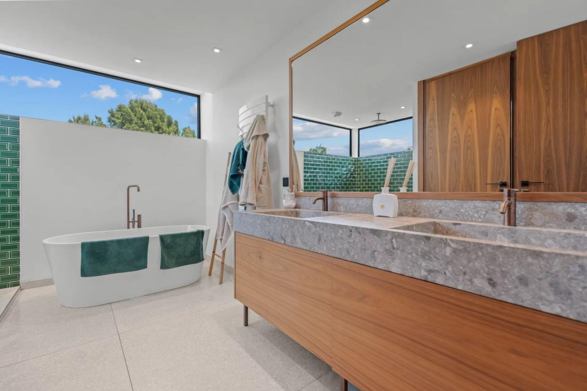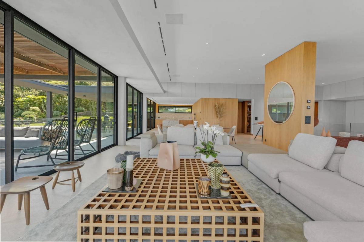 The villa features spacious and bright reception areas thanks to full-height windows, an open-plan kitchen and dining area, and 6 en-suite bedrooms including a Master suite with dressing room. Additional amenities include a 12-seat cinema, wine cellar, laundry room and storage.
