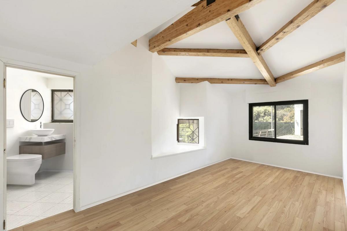 Das Hauptgeschoss verfugt uber ein grosszugiges Wohnzimmer mit Kathedralendecke, das durch sichtbare Balken und grosse Fensterfronten gepragt ist und direkten Zugang zu den Steinterrassen und dem Garten bietet. Angrenzend befinden sich das Esszimmer und die Kuche, beide ebenfalls mit direktem Zugang ins Freie.