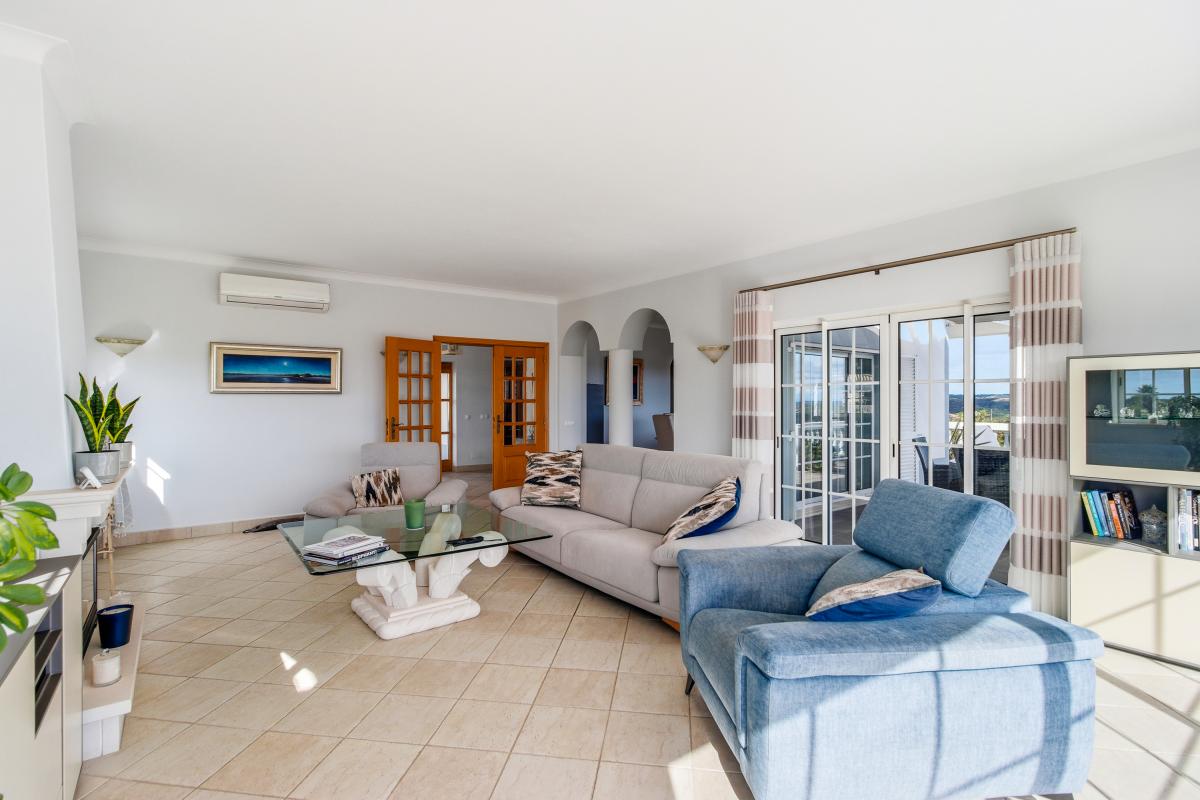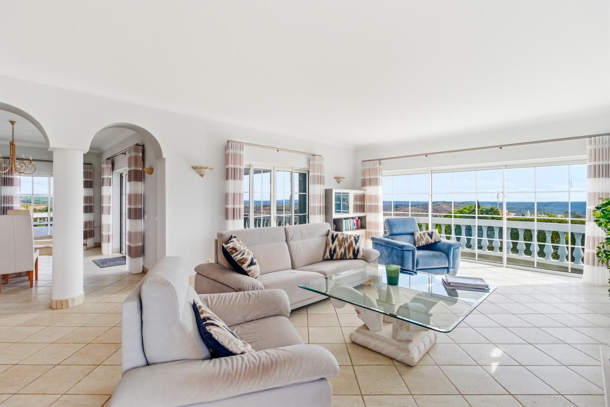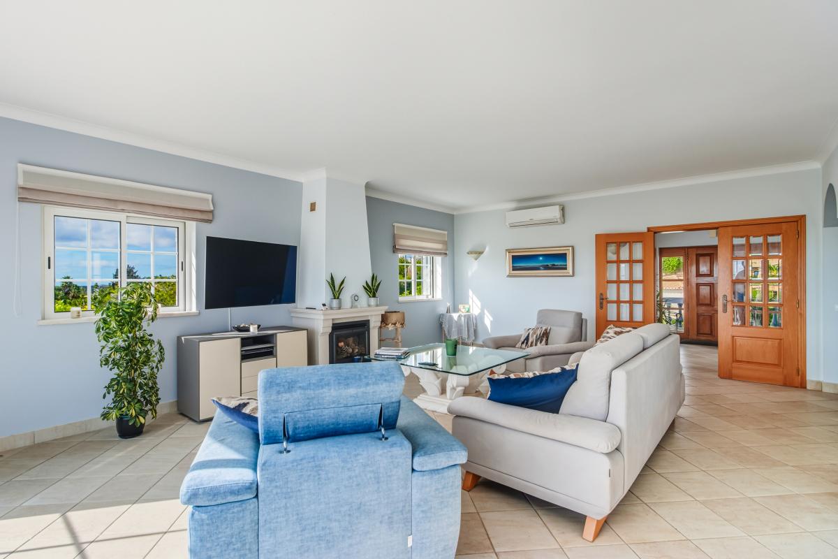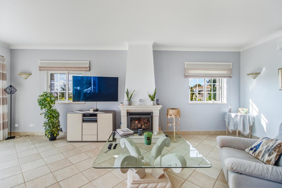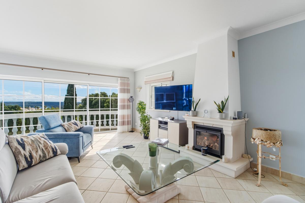 Discover this beautiful and secluded villa for sale in Algarve, perfectly located on the 3rd Phase of the prestigious Parque da Floresta Golf & Leisure Resort. Surrounded by mature gardens, it offers peace, privacy, and stunning views of the countryside, Monchique mountains, and distant sea.The bright entrance hall opens into an elegant open-plan living and dining area with a fully equipped kitchen. Large sliding doors lead to spacious balconies — ideal for entertaining, dining al fresco, or simply relaxing with panoramic views. A cozy fireplace adds warmth, and a guest toilet completes this level.