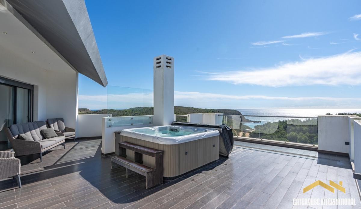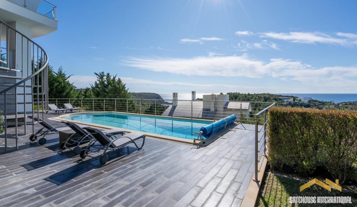 Sea View 5 Bed Modern Villa in Burgau West Algarve - this stunning beach front villa with 5 bedrooms and 5 bathrooms on 3 levels measures 425m2 with a heated swimming pool with fabulous sea views. The villa comprises a ground floor level with an entrance hall, an open-plan living and dining area with large glass doors opening onto a wraparound south-facing terrace, a sleek, fully fitted kitchen and breakfast room. The master suite is on the ground floor, featuring a walk-in wardrobe, a luxurious en-suite bathroom with both a shower and a bathtub with access to the sun terrace. The first floor has 2 good-sized guest suites, each with direct access to another terrace with magnificent views. This terrace features seating areas plus a Jacuzzi hot tub. The lower level of the property has a games room, an ideal space for family fun or leisure activities. There are 2 additional bedroom suites with one currently serving as a gym. Both suites open onto a covered terrace. Outside, the landscaped garden is low-maintenance with a 10 x 5 metre heated pool plus there is a double garage. The beautiful Cabanas Velhas beach is just a short stroll away, offering golden sands and crystal-clear waters. The charming village of Burgau, known for its traditional character and lively atmosphere, is only a few minutes' drive. Additionally, Praia da Luz and the vibrant town of Lagos are both within a 10-minute drive, while the unspoiled beaches of the west coast are practically on your doorstep. in brief: - entrance hall - cloakroom - lounge - diner - kitchen - 5 bedrooms - 5 bathrooms - games room - heated swimming pool - double garage