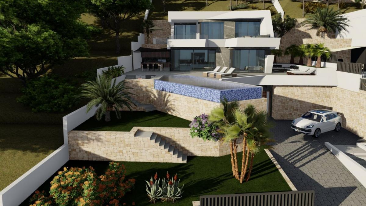 New Built villa in Calpe with panoramic views of all of Calpe. villa built on three levels, connected by an interior lift. New Build villa has four bedrooms, five bathrooms, guest toilet, open-plan kitchen with the lounge area, fitted wardrobes, private garden with, air-conditioning, elevator, garage, parking, barbecue, porch, Jacuzzi, storage room, electrical appliances, Located in the urbanization Maryvilla in Calpe, a short distance from the beach and all the necessary services. Calpe, one of the towns of La Marina Alta, lies on the northern coast of the province of Alicante, surrounded by the towns of Altea, Benidorm, Teulada-Moraira, Benissa. Calpe has a wonderful mixture of old Valencian culture and modern tourist facilities. it is a great base from which to explore the local area or enjoy the many local beaches. Calpe alone has three of the most beautiful sandy beaches on the coast. Calpe also has two Sailing Clubs: Real Club Nautico de Calpe and Club Nautico de Puerto Blanco. Fishing village of Calpe now transformed into a tourist magnet, the town sits in a perfect location, easily accessed by the A7 motorway and the N332 that runs from Valencia to Alicante; its approximately one hour drive from the airport at Alicante and 1,5 hours to Valencias airport.
