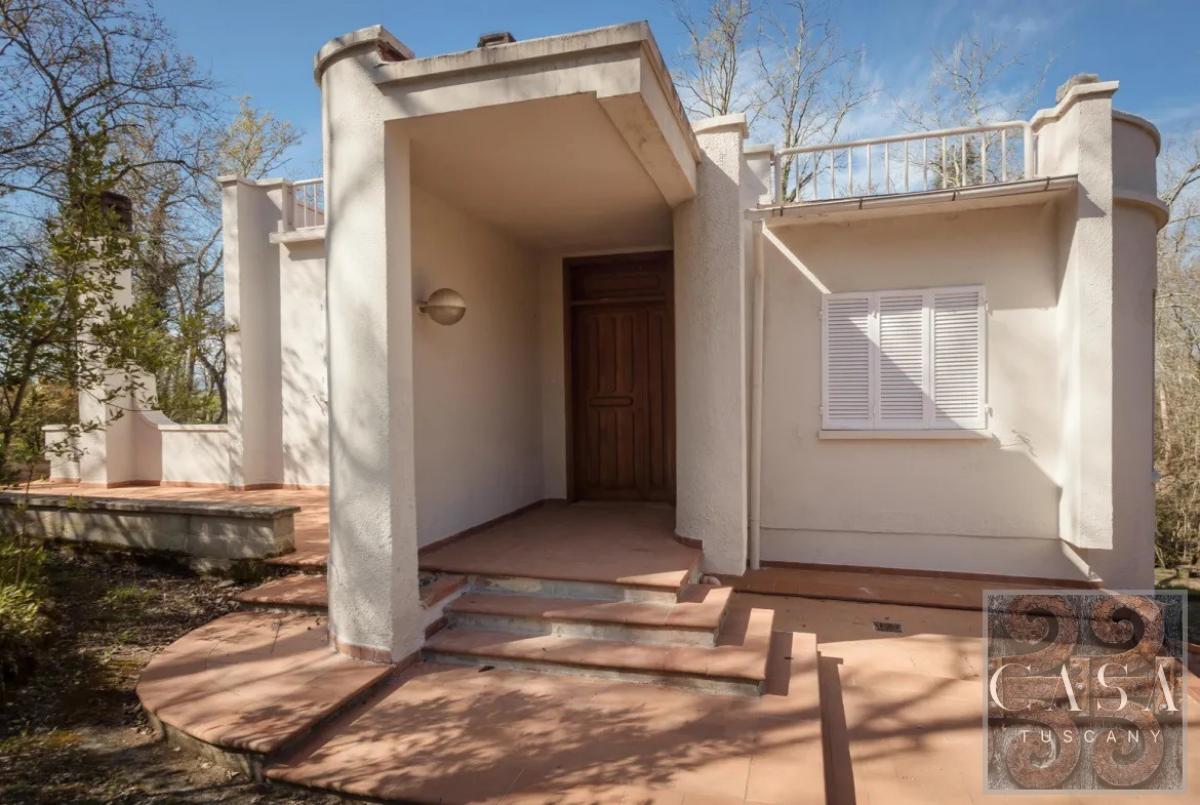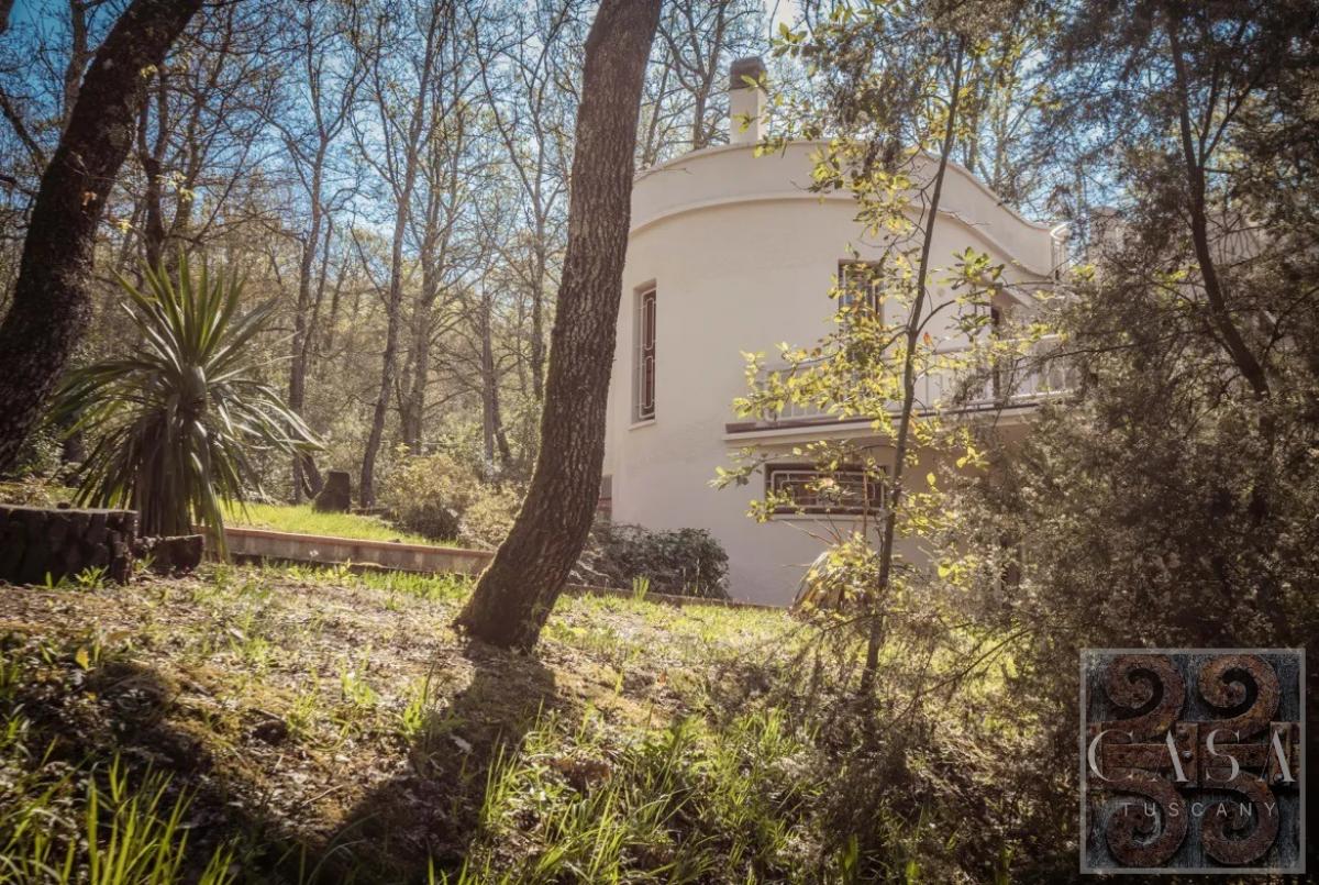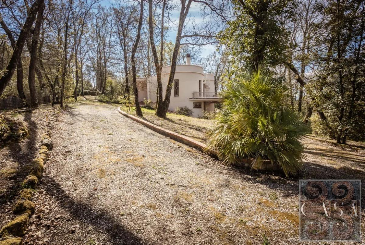 Elegant villa built in the 1970s in the Art Deco style, in a private location in the hills of the Alta Valdera, in the Province of Pisa, in the center of a large woods of over 1 hectare..