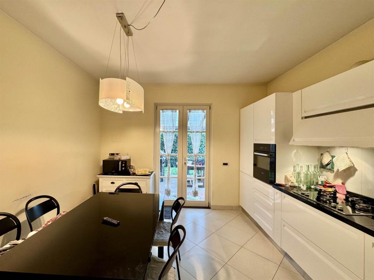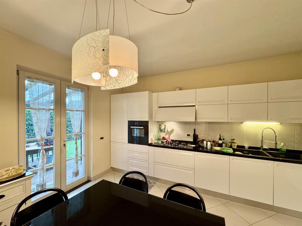 Outside, the villa is surrounded by a well-kept private garden of approximately 300 sqm on three sides, complete with irrigation system and a covered portico ideal also as a car shelter. The property is in excellent condition and is sold fully furnished, including custom-made kitchen and bathroom furniture. Set in a quiet and high-quality residential area, it offers comfort, privacy, and easy access to nearby services.