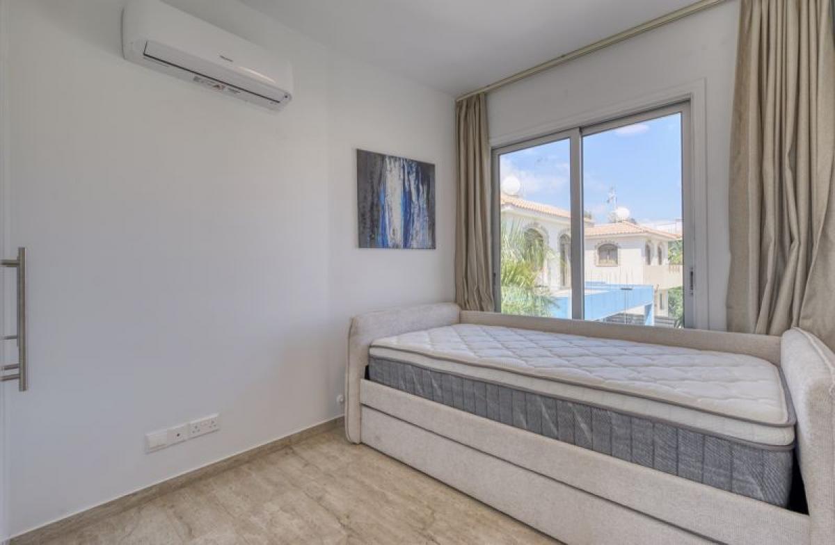 Five Bedroom Detached Villa which includes Basement Apartment and Roof Terrace with Excellent Sea Views For Sale in Protaras, with Title Deeds close to the National Park of Cape Greco and just a few minutes to the Konnos beach.This recently refurbished throughout villa has been designed to combine outdoor living whilst taking in the stunning views over the sparkling Mediterranean Sea. As you enter the villa through the front door, you are met with a spacious open plan lounge, dining area and modern, fully fitted kitchen and quest WC. There are 2 x sets of sliding double glazed doors leading out from the living area onto the rear partly covered veranda, private swimming pool with outdoor shower and low maintainable garden. Upstairs there is a modern fully tiled family bathroom with walk in shower and three double bedrooms, all with fitted wardrobes and access to balconies with stunning views. Internal staircase will also take to the basement apartment which boasts an open plan kitchenette with laundrette, lounge area with AC unit, modern bathroom with walk in shower and two double bedrooms both with fitted wardrobes and AC units.