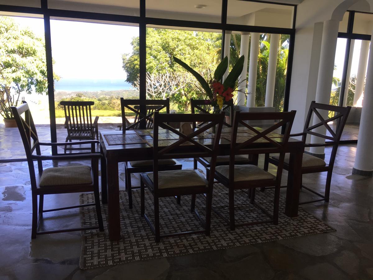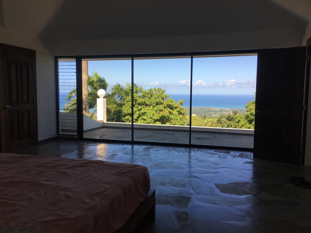 A breathtaking mountain top villa with panoramic ocean views above Las Terrenas on the Samana peninsula. The villa has 2 bedrooms and 2 1/2 bathrooms : master bedroom ocupies the top floor with private bathrooms and a terrace with spectacular ocean views. There are ocean views from every room in the house. The main label has a large terrace that leads to a large hilltop infinity pool with crystal water that seems to blend into the distan ocean. The villa was designed by a Swiss architect, to be self-sufficient and independent as much as possible. Amenities include a deep well that provides quality drinking water and an independent electricity supply that includes solar panels, inverters and a backup generator (which is really needed). Below the villa on the lower driveway is a separate building which includes a maid's apartment, workshop, generator room, and a fuel tank. The elevation of the villa is approximate 330 meters above sea level and creates cooling breezes and very pleasant temperatures. The distance to the town of Las Terrenas is 5km, which provides tranquility in the villa, but proximity to international restaurants, supermarkets and shopping when needed. The rural road from the main road to the villa's entrance is approx. 500 meters, which keeps it's privacy ( a 4WD vehicle is required in rainy season). The villa sits on a parcel of 18,100 m2 of land. The panoramic view over the Atlantic and the surrounding scenery is magnificent. The land has coconut trees and tropical fruits.