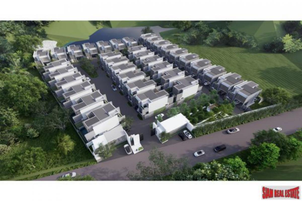 The villas exude a modern aesthetic, featuring neutral tones of white and blue, with homes crafted to offer clean, spacious environments, characterized by open living spaces and flat roof designs. Total project area over 8 rai ( 2,814.4 sqm).