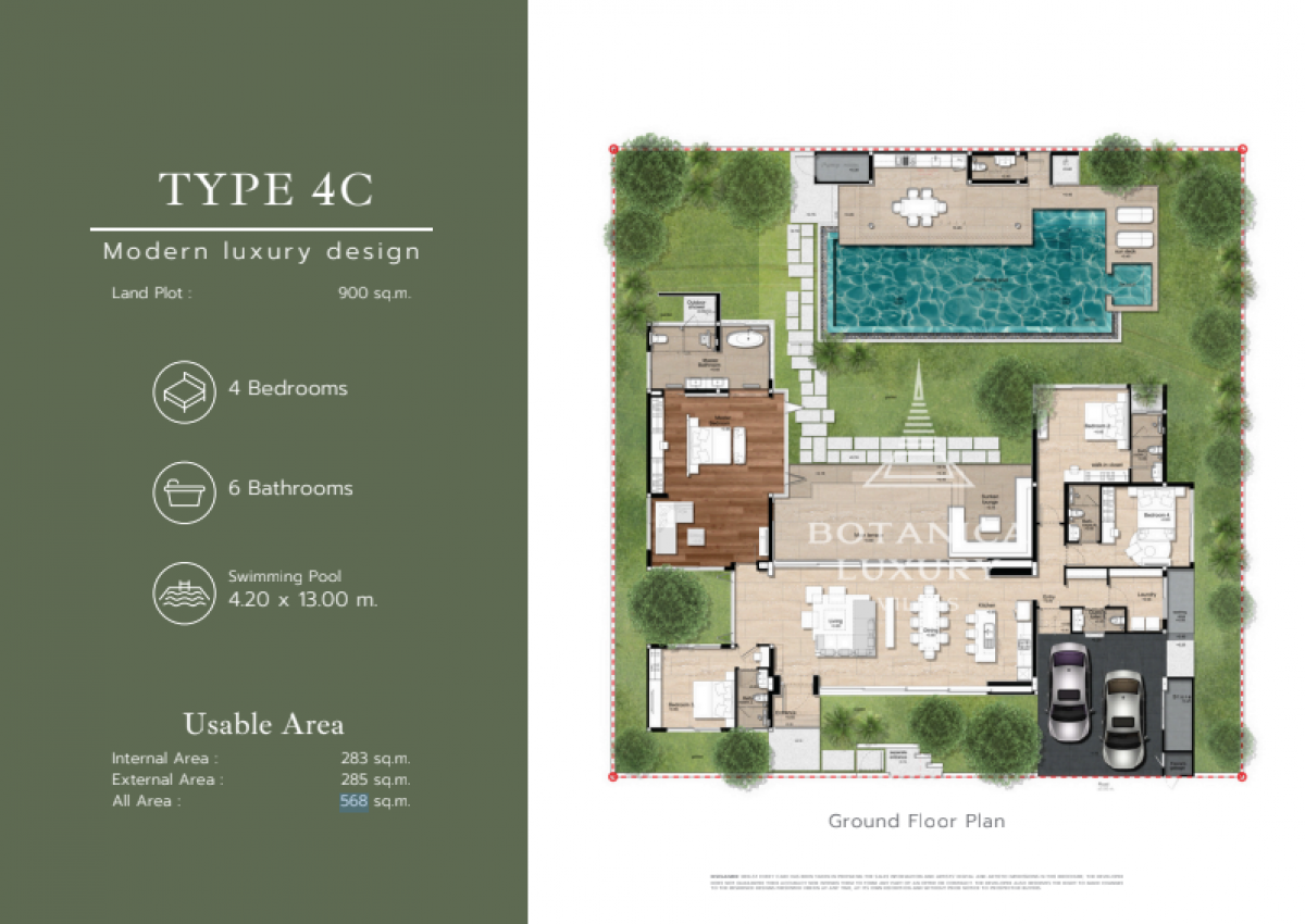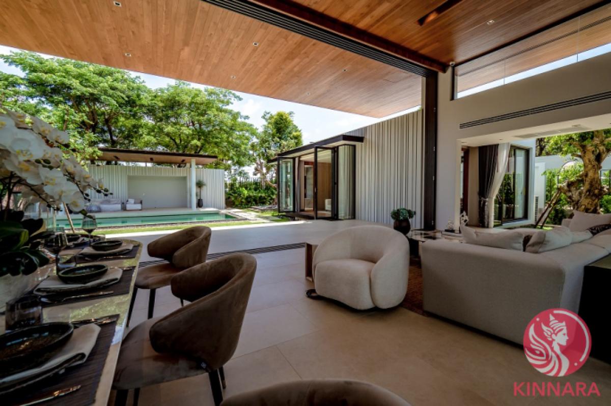 Botanica Forestique Type 4CNestled in the prestigious BangtaoLaguna area, the Botanica Luxury Villas have earned recognition as the Best Luxury Villa Development in Phuket. Boasting eight meticulously crafted projects comprised of over one hundred custom-built residences, this exceptional property development offers a collection of unique, spacious layouts to suit any discerning buyer.At Botanica Luxury Villas, buyers have the rare opportunity to bring their dream home to life with the assistance of renowned architects and developers. Each villa showcases a consistent exterior design while offering the flexibility for customization, allowing future owners to curate their ideal living space.Situated just moments away from an eight-kilometer stretch of pristine white sandy beach, residents will find themselves immersed in a vibrant neighborhood teeming with boutique shops, restaurants, and an array of family-friendly activities. The nearby Laguna Phuket Golf course and Canal Village shopping center provide additional conveniences for every lifestyle.Designed by one of Phukets most esteemed architects, each villa at Botanica seamlessly blends artistic vision with functional indoor-outdoor living spaces to create a truly unique and tropical retreat. A standout feature includes a covered terrace that doubles as a versatile lounge or dining area, accentuated by wooden columns that enhance the overall aesthetic appeal. The seamless connection between indoor and outdoor spaces is further accentuated by matching tiling in the front room and terrace.Central to each villa is an inviting natural stone-tiled infinity-edge swimming pool, perfect for relaxation and entertainment. The open floor plans feature folding doors, transom windows above doorways, and vaulted ceilings, all enhancing the luxurious outdoor experience that defines these exceptional residences.