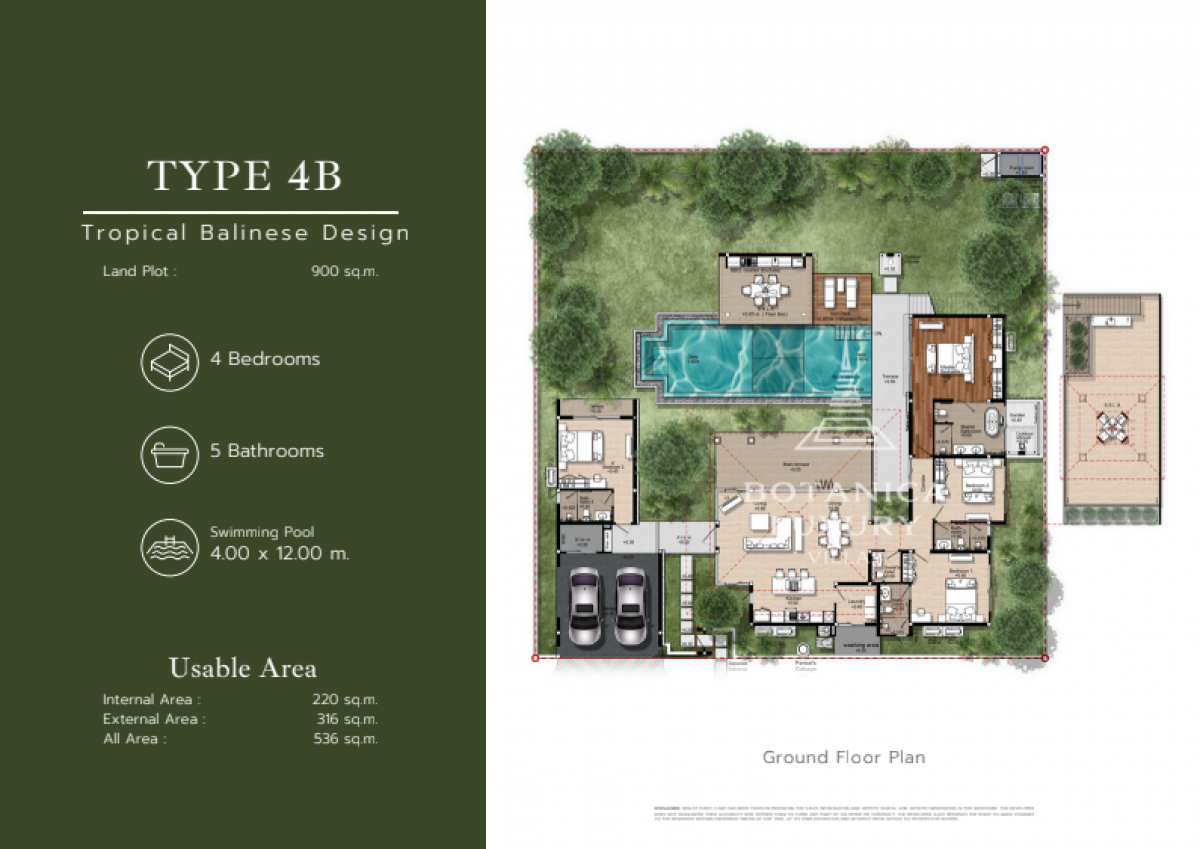 Botanica Forestique Type 4BIntroducing the exquisite Botanica Forestique, the newest phase of modern and luxurious pool villas by an esteemed villa developer with a proven track record of delivering 14 successful villa projects in Phuket. Nestled in a highly coveted residential area near the prestigious Laguna complex and pristine Layan Beach, this development comprises 27 elegant tropical pool villas.Crafted for unparalleled comfort and convenience, each villa at Botanica Forestique offers single-level living, ideal for those seeking a sophisticated tropical abode without the hassle of stairs. Boasting premium features including a sizable swimming pool, built-in wardrobes, contemporary kitchens, and expansive open-plan living and dining areas, these residences are designed to exceed expectations.With plot sizes ranging from 656 sqm to 1030 sqm and generous built-up areas from 424 sqm to 567 sqm, every villa presents a thoughtfully planned 4-bedroom floor plan. Step outside to discover the serene outdoor spaces adorned with lush green lawns, a private swimming pool measuring either 10.8m or 13m in length, and a spacious pavilion equipped with cozy lounge seatinga perfect setting for relaxation and entertainment in the heart of natures beauty.