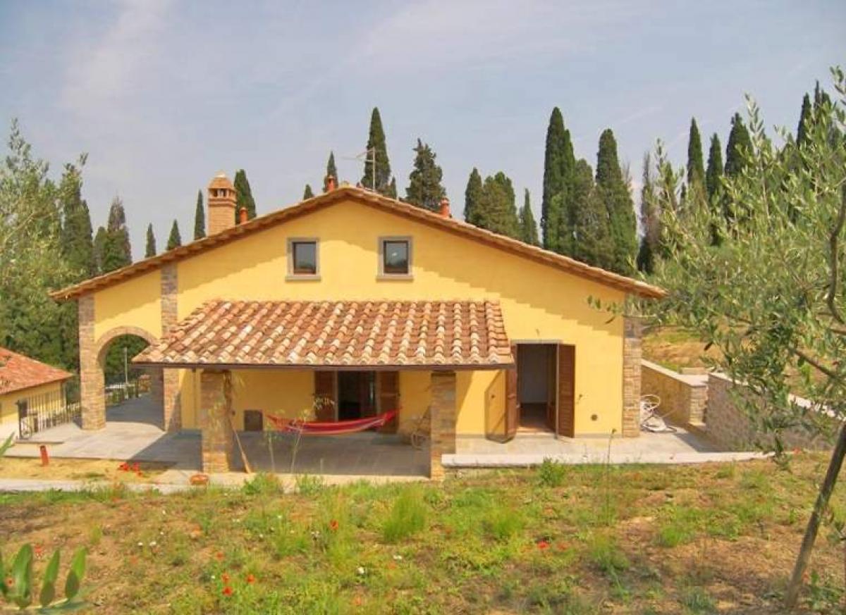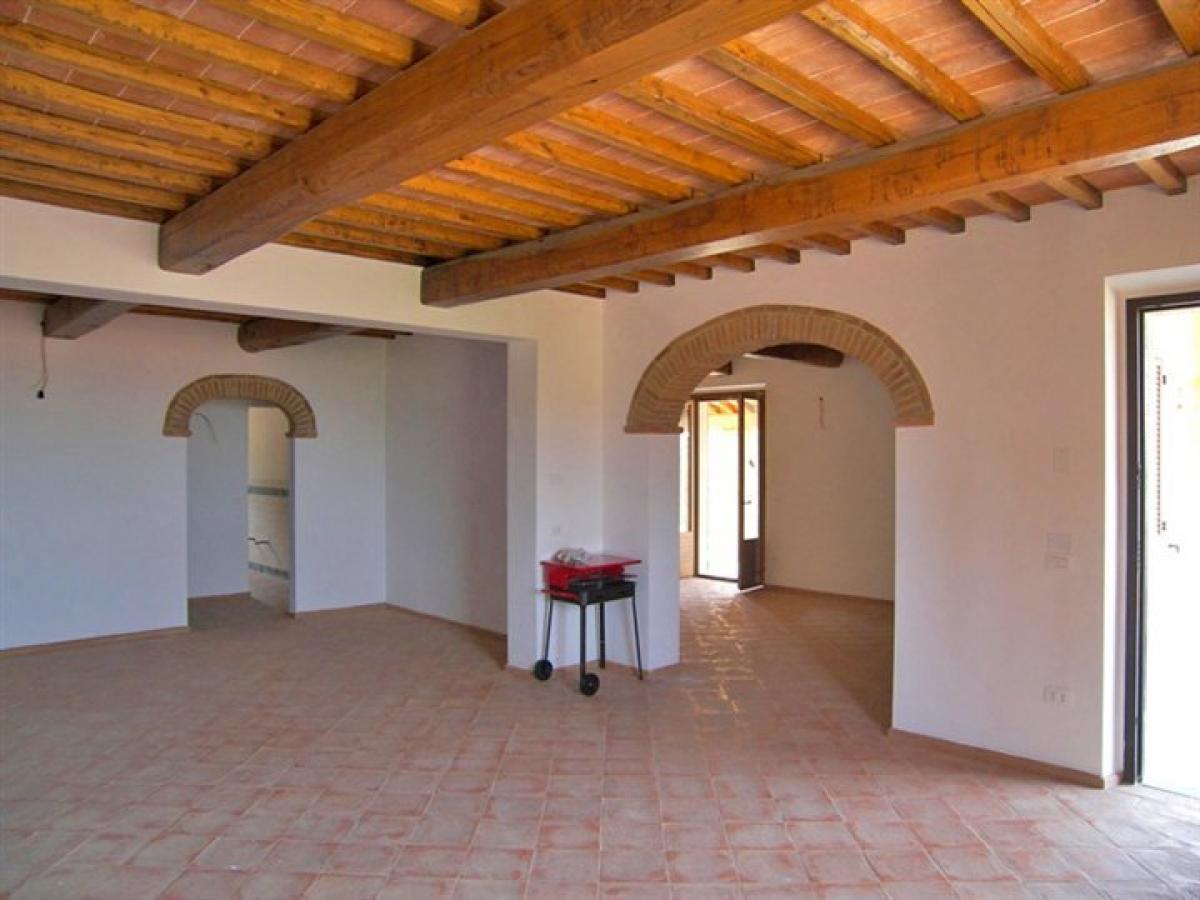 The villa is characterized by high-quality details such as wooden beam ceilings, exposed brick arches, terracotta floors, solid wood doors, and chestnut wood windows and shutters, all emphasizing its rustic and traditional charm.
