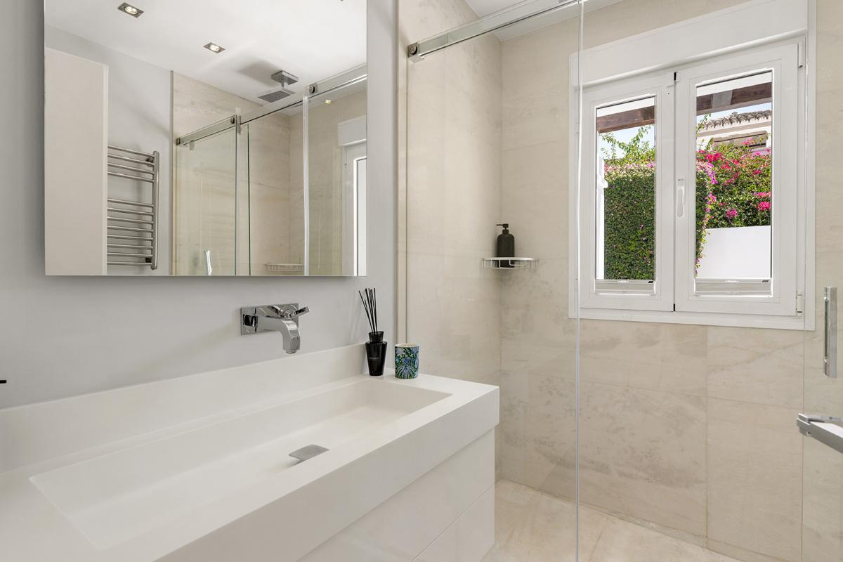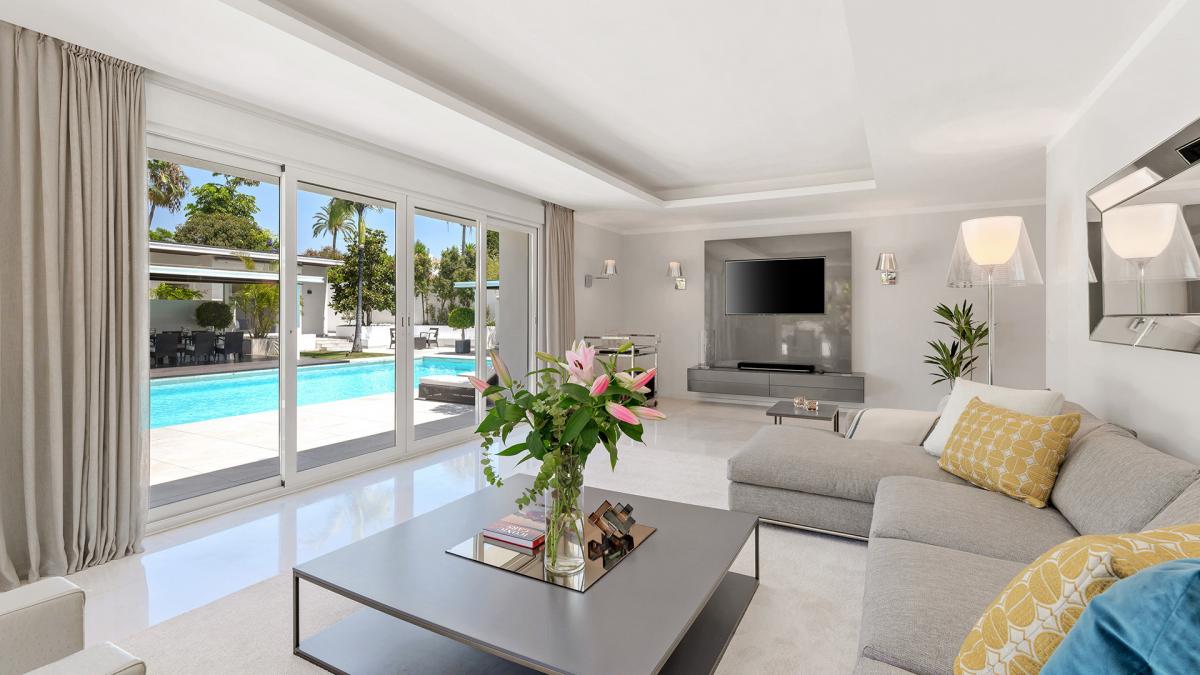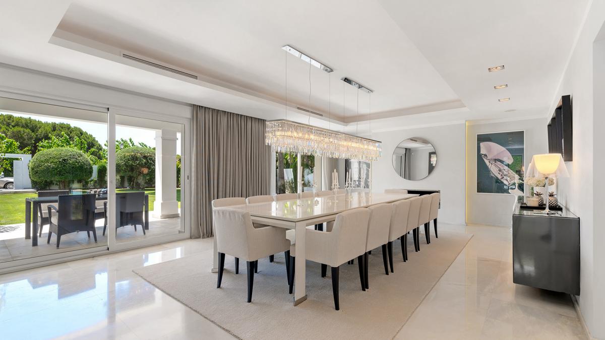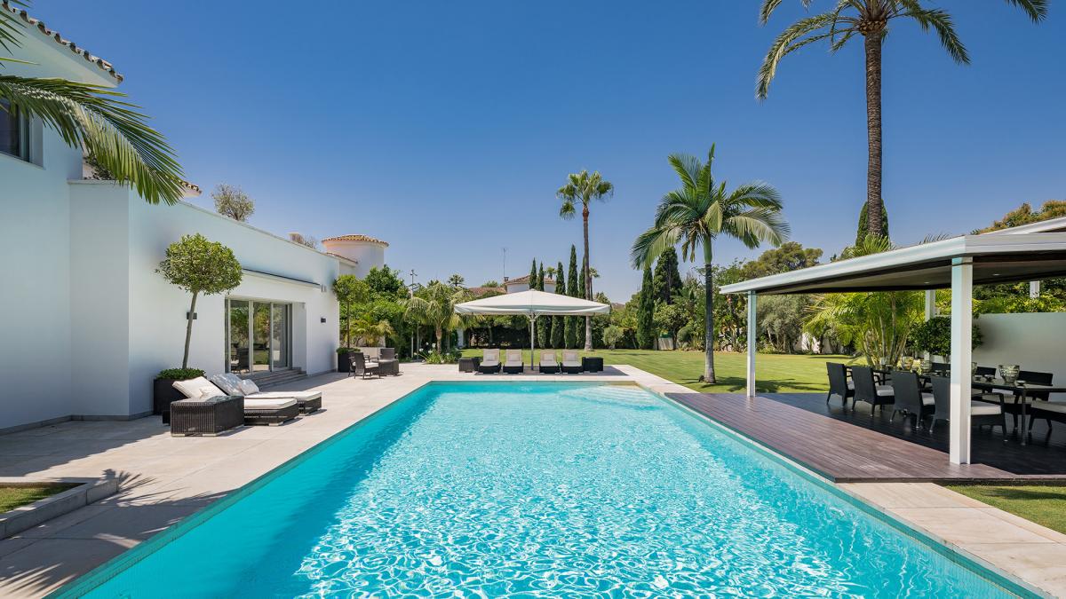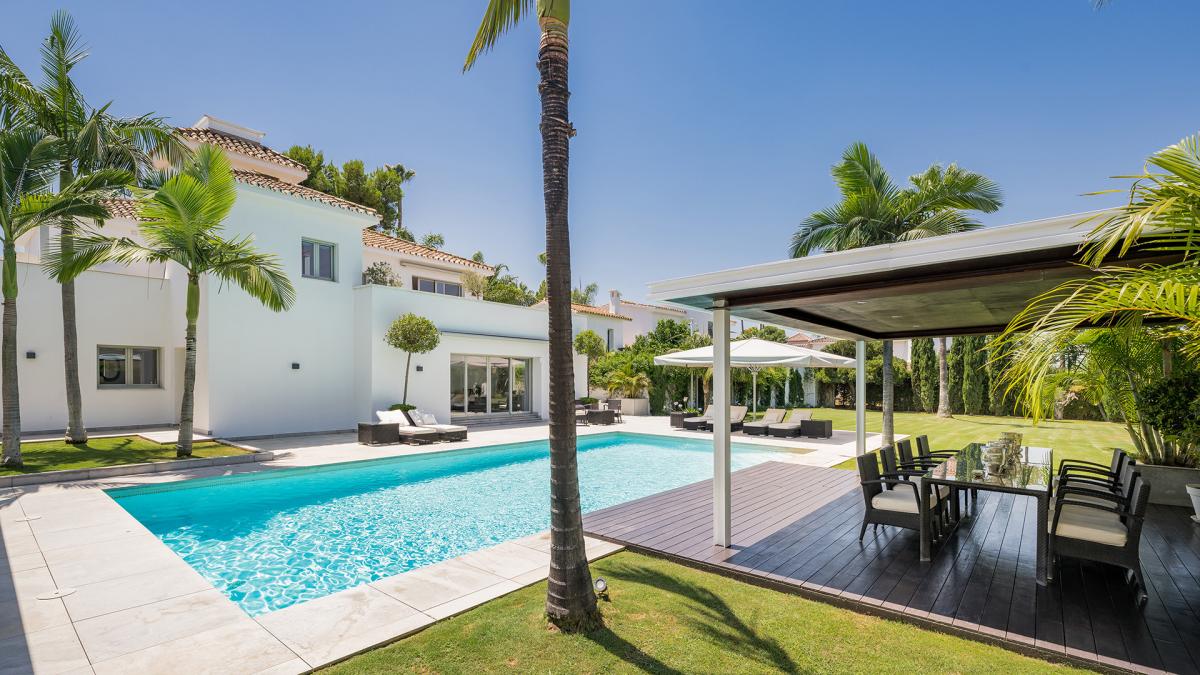 Casa Solara is an immaculately presented villa benefits from an excellent location 100m from the beach in Estepona's New Golden Mile. The villa showcases a beautiful blend of traditional Mediterranean styles with modern design elements, resulting in a home of timeless appeal and exceptional elegance. Arriving at the property, an automated gate opens allowing vehicles to enter directly into an enclosed 2-car garage with more space in the driveway. The landscaped gardens near the entrance provide a glimpse of the levels of luxury and quality to be found all throughout the property. Entering the villa through its front door, there is an entry vestibule that leads directly into a generously sized dining area and further into the exquisite living room. Large glass double doors in both spaces open to the garden and allow for sunlight to flow into the villa. The fully fitted modern kitchen is located to the right of the main entrance and boasts built-in high-end appliances, ample countertops and an adjacent laundry room. There is one guest suite on this level with garden access and a private bathroom, in addition to a home office room that can be converted into an additional bedroom. Upstairs there are three more bedrooms, including the spectacular master bedroom with its large dressing room and lovely views of the surrounding areas. The two guest suites have south-facing views toward the front of the home one including a sauna. All the rooms access the various terraces upstairs, and the entire main house benefits from underfloor heating. The property also has a domotic system with touch screens installed and a full security system with an array of cameras and sensors. Outside, the home presents a marvelous pool area, surrounded by ample lawns and space to sunbathe, and overlooked by a pool bar complete with a summer kitchen and seating areas. To the other side of the pool is the guest house, which is comprised of two bedrooms, a living room, and a fully fitted kitchen.The guest house showcases the same luxurious qualities as the rest of the villa and has its own separate entrance and terrace. The seventh bedroom of the estate is located just off the garage and has its own kitchenette and bathroom, making it ideal as service or guest quarters. The guest house is also fitted with underfloor heating. Since this is a double plot there is the possibility to extend the house or in fact build a new house in the second plot. The pristine estate is located in a tranquil part of El Paraiso Barronal, just 150m from the beach. The area is near a wide range of amenities including shops, restaurants, and international schools. Several top golf courses are within a short distance, and by car, the centres of both Estepona and Marbella are 10 minutes away while Malaga airport is 45 minutes drive.