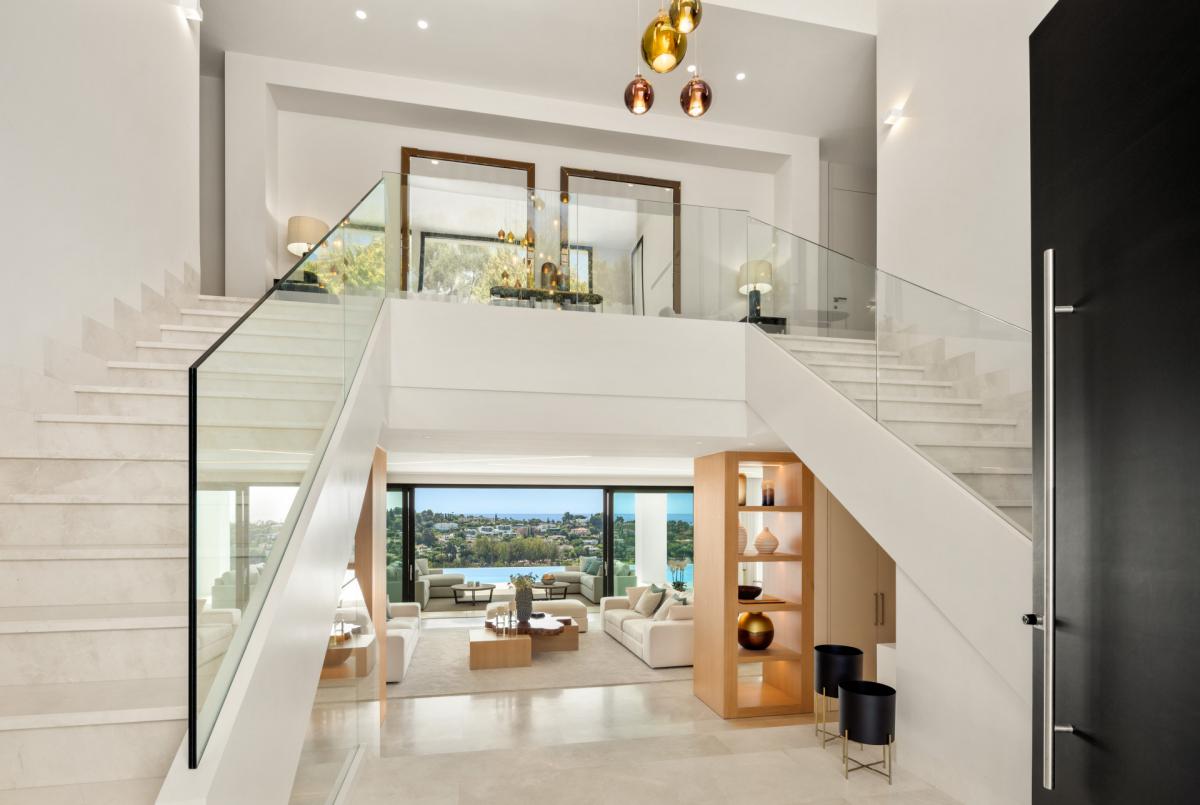 Located in the prestigious El Paraiso area of Estepona, this contemporary villa boasts an impressive 2,500 m plot with a southeast orientation. The property offers stunning panoramic views encompassing the El Paraiso golf course, the iconic La Concha mountain, and the Mediterranean Sea. The villa's strategic positioning ensures stunning sunrises and sunsets, making every moment a picturesque experience.The villa's exterior is ideal for those who enjoy outdoor living. The ground floor terrace is an oasis of relaxation and entertainment, featuring quiet chill-out corners, an outdoor BBQ area, and an al fresco dining space. The highlight is the zero-edge infinity pool and outdoor jacuzzi, perfect for unwinding while soaking in the scenic views. The living space offers sophisticated comfort with its neutral palette and warm accents. The dining area and kitchen blend functionality and style, featuring a generously sized kitchen island that doubles as a floating dining table, ideal for social gatherings and culinary adventures.The villa comprises 7 bedrooms and 8 bathrooms, designed with meticulous attention to detail. The main bedroom offers gorgeous views and direct access to the upper-level terrace. its walk-in wardrobe is complete with a dedicated area for jewellery and accessories. The primary bathroom, with elegant marble, includes a double vanity, a shower, and a strategically placed bathtub to maximise the views. A home office provides a productive workspace, while the SPA, complete with a sauna and Turkish bath, is a sanctuary for relaxation. The entertainment room is a highlight, featuring a home cinema, billiard table, and a custom-designed bar with dual wine coolers, setting the stage for memorable moments.The villa is situated in Estepona's prestigious El Paraiso area, and a short drive takes you to the luxurious Puerto Banus. At the same time, golf enthusiasts will appreciate the proximity to the renowned Golf Valley and Guadalmina Golf Club. Estepona town, known for its charming ambience, is easily reachable, offering a perfect mix of traditional appeal and modern conveniences. The property is also conveniently located near essential amenities, including supermarkets, top international schools, and high-quality healthcare facilities.