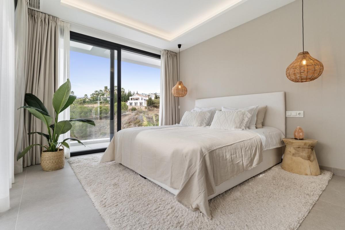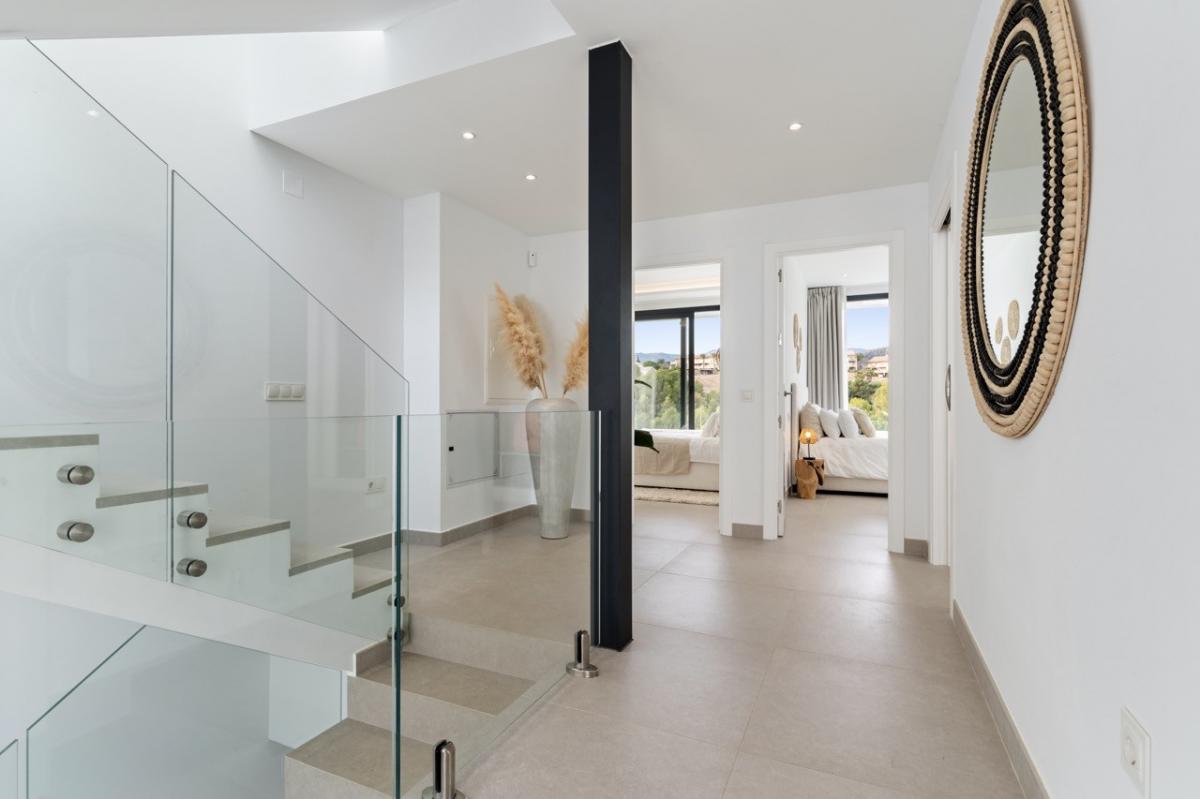 This modern and contemporary villa, located in the prestigious La Resina Golf, offers stunning west-facing views of the surrounding mountains and golf course. Designed to perfection, the villa beautifully blends sleek contemporary architecture with stylish interiors, creating an ideal space for luxurious living. its open-plan layout seamlessly connects the indoor and outdoor areas, perfect for those who appreciate the Mediterranean lifestyle.Spanning four levels, the villa features a thoughtful distribution of space to ensure comfort and privacy for all its residents. The main floor boasts a spacious open-plan living and dining area that flows effortlessly into the fully equipped kitchen. One bedroom and a bathroom complete this level, providing convenience and functionality for guests or family members.On the upper floor, youll find three elegant ensuite bedrooms, each offering an ideal retreat with ample natural light and high-quality finishes. Whether for family or visiting guests, these private spaces offer peace and comfort with spectacular views of the golf course and mountains. The villa's roof terrace is a standout feature, offering an outdoor gym and a luxurious jacuzzi, making it the perfect spot to unwind while enjoying breathtaking views.The lower level is a versatile space, offering two additional bedrooms, a bathroom, and a spacious storage area. A dedicated multimedia room provides the perfect place for entertainment and relaxation, making this home a truly unique living experience. Whether youre looking for a serene retreat or an entertainers dream, this villa offers the best of both worlds.Additionally, this exceptional villa is conveniently located just 30 minutes away from key amenities, including Mlaga and Gibraltar airports, providing easy access for international travel. The area also offers a wide range of local services such as schools, public transport links, shopping centers, parks, and hospitals, ensuring that all your daily needs are within close reach. Whether you're commuting for work or enjoying leisure activities, this location offers both tranquility and practicality for modern living.