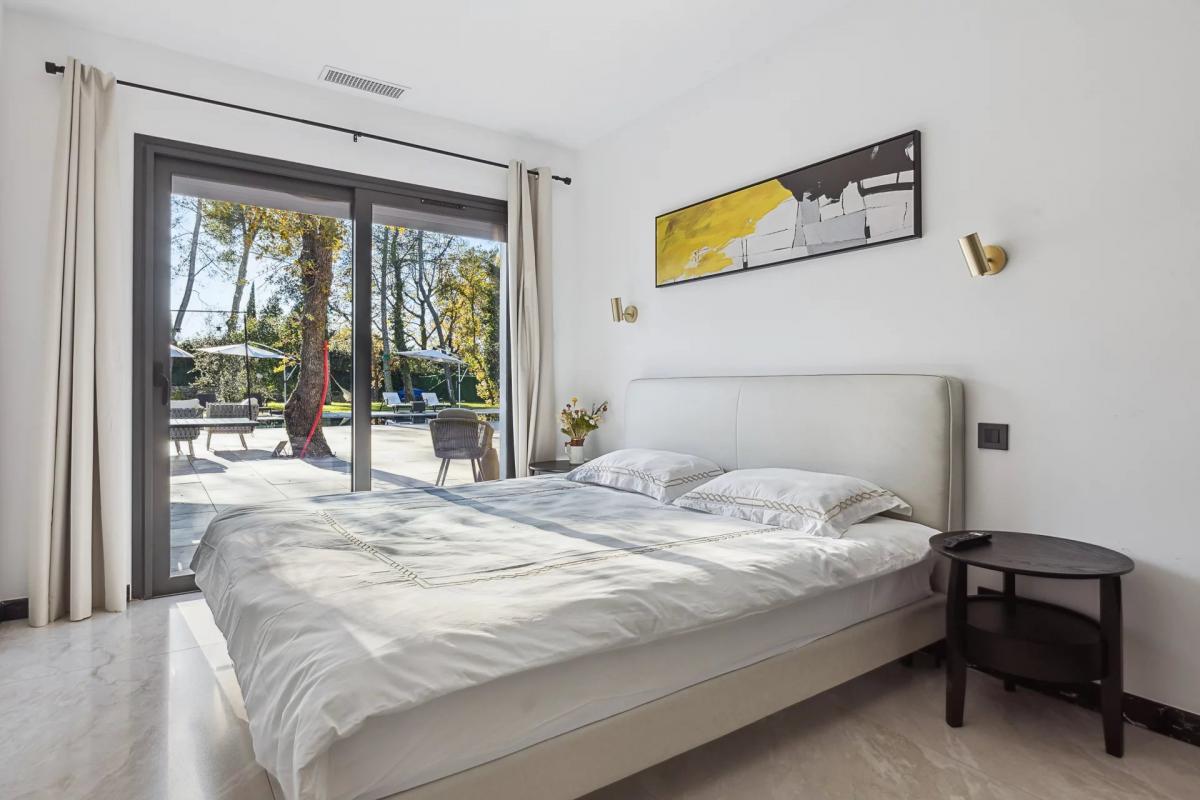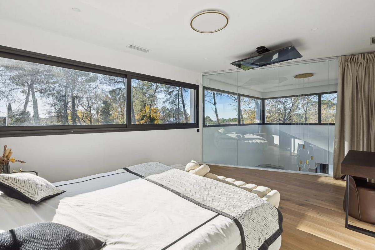 Eine prachtige Mastersuite, die dank eines einzigartigen Transparenzspiels von Licht durchflutet wird. Sie verfugt uber ein Buro mit Zugang zu einer privaten Terrasse, einen begehbaren Kleiderschrank und ein angrenzendes Badezimmer.