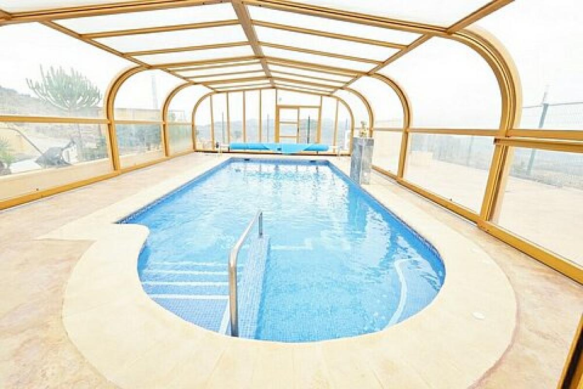 Outside, the property features a glass-enclosed pool measuring approximately 3 x 8 m, perfect for relaxing while taking in the stunning panoramic mountain views.