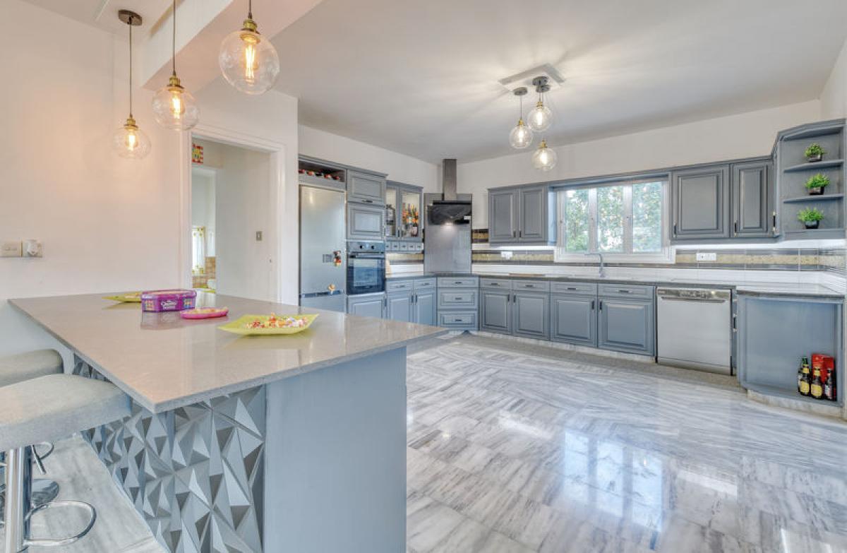 The ground floor features generous open-plan living areas finished with elegant marble flooring throughout. The main kitchen is a striking yet functional space, centred around a large island that is ideal for both everyday living and entertaining. A second fully equipped kitchen adds exceptional versatility, making the property well suited to multi-generational living or hosting without disrupting the main living areas. A unique integrated feature fish tank beneath the staircase adds architectural interest, while a guest WC completes the ground-floor accommodation.