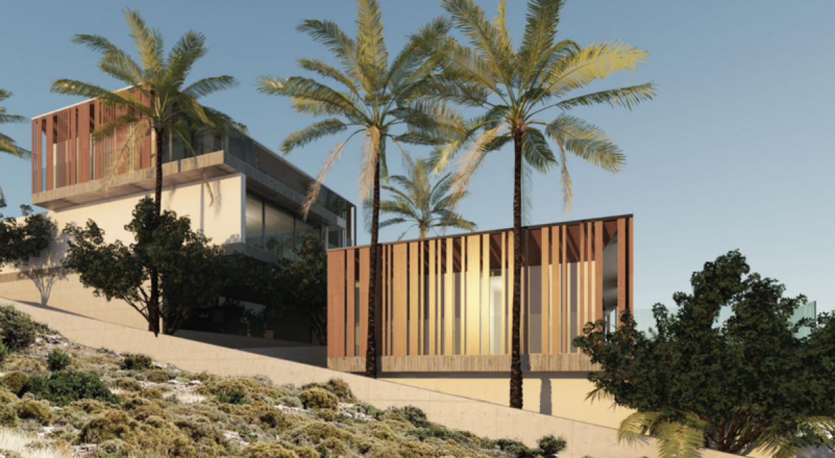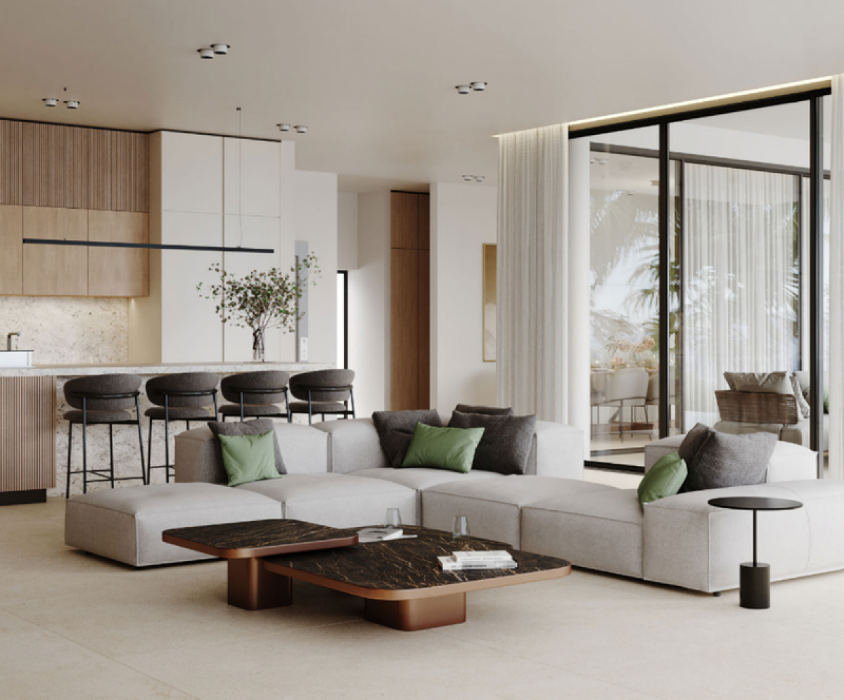 The villa is designed across three levels, creating an open, light-filled living space with floor-to-ceiling windows in the open-plan kitchen and living area. The large underground basement, equipped with a bedroom, kitchenette, WC, and flexible space perfect for a gym, adds substantial functionality. Upstairs, three spacious bedrooms and two stylish bathrooms provide comfortable accommodation, with an additional guest toilet for convenience.
