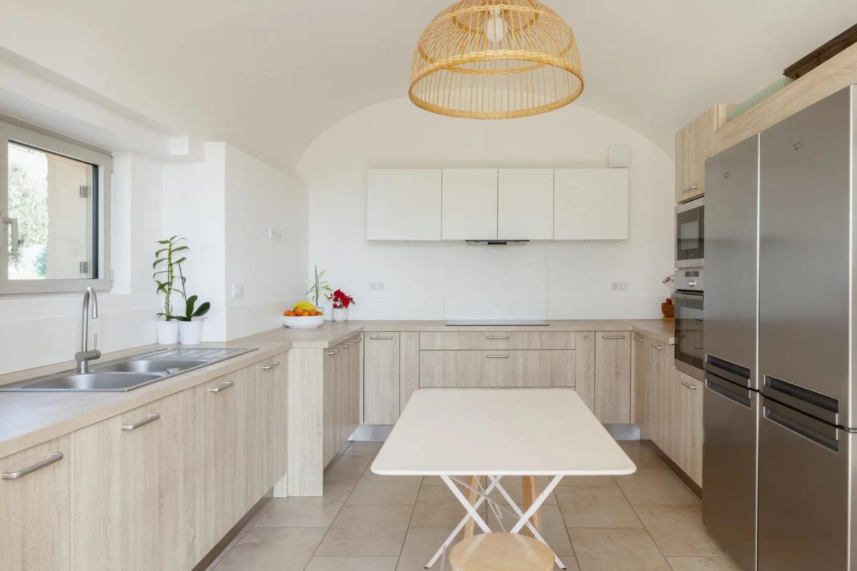 The house opens onto a large entrance hall leading to a spacious living room, illuminated by large sliding glass doors that enhance the brightness of the space. An elegant office with beautiful vaults, a fully equipped kitchen, and a dining room in the vaulted part complete the ground floor, creating a welcoming and refined living space.