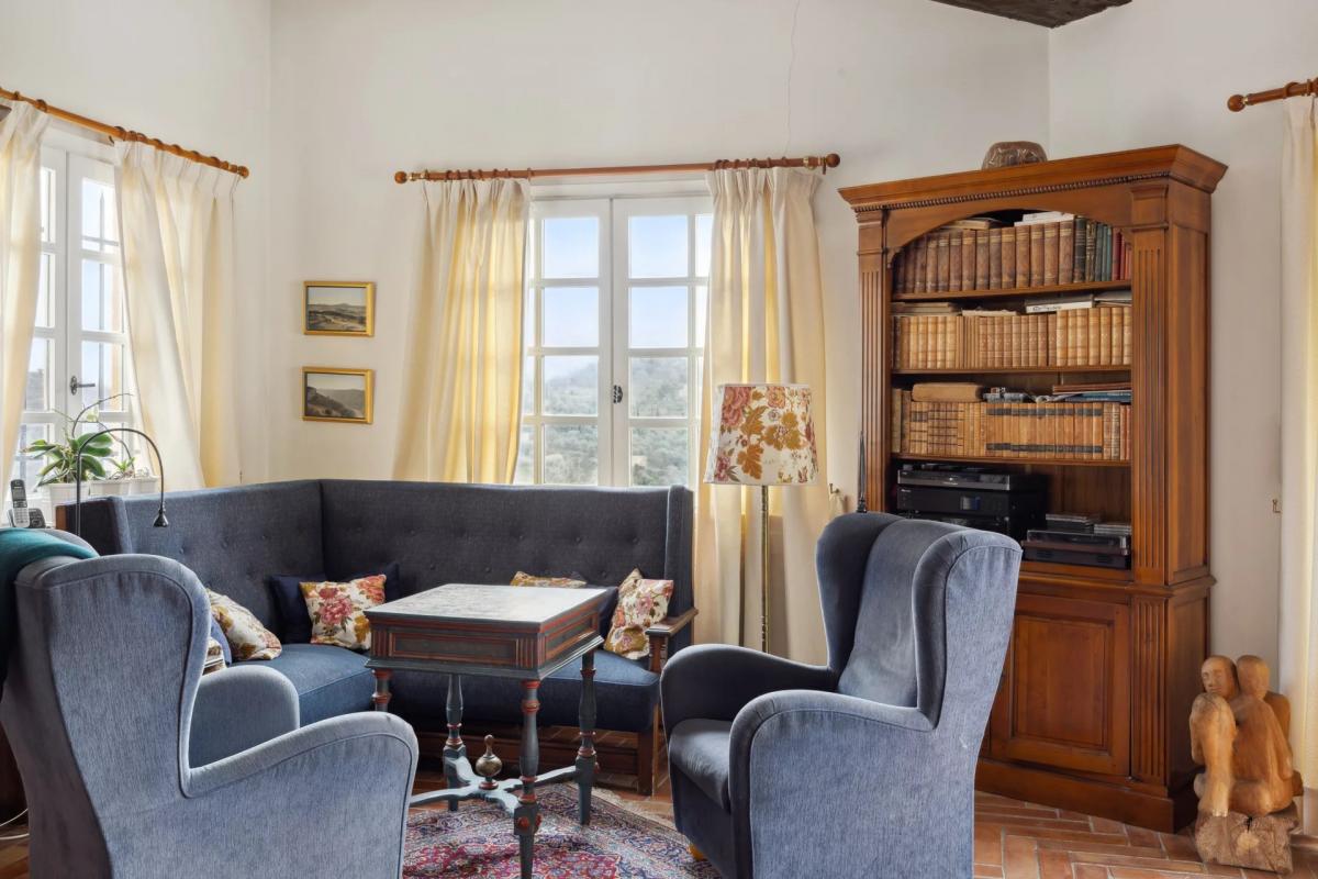 The kitchen, with access to the outside, offers a beautiful view. There is also the option of converting the basement into an independent flat (90sqm). The garden is planted with fruit trees, cypresses and olive trees, and has a semi-automatic watering system.