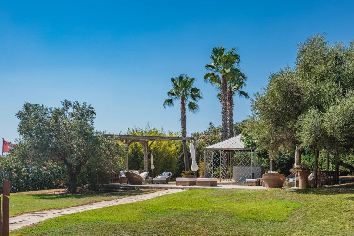 Unterhalb des Hauses befindet sich der ca. 4600 m2 grosse mediterrane Garten mit einer grossen Terrasse und einem beheizten Pool mit Blick auf das Meer, der zu jeder Tageszeit ein wahrhaft lebendiges Bild bietet.