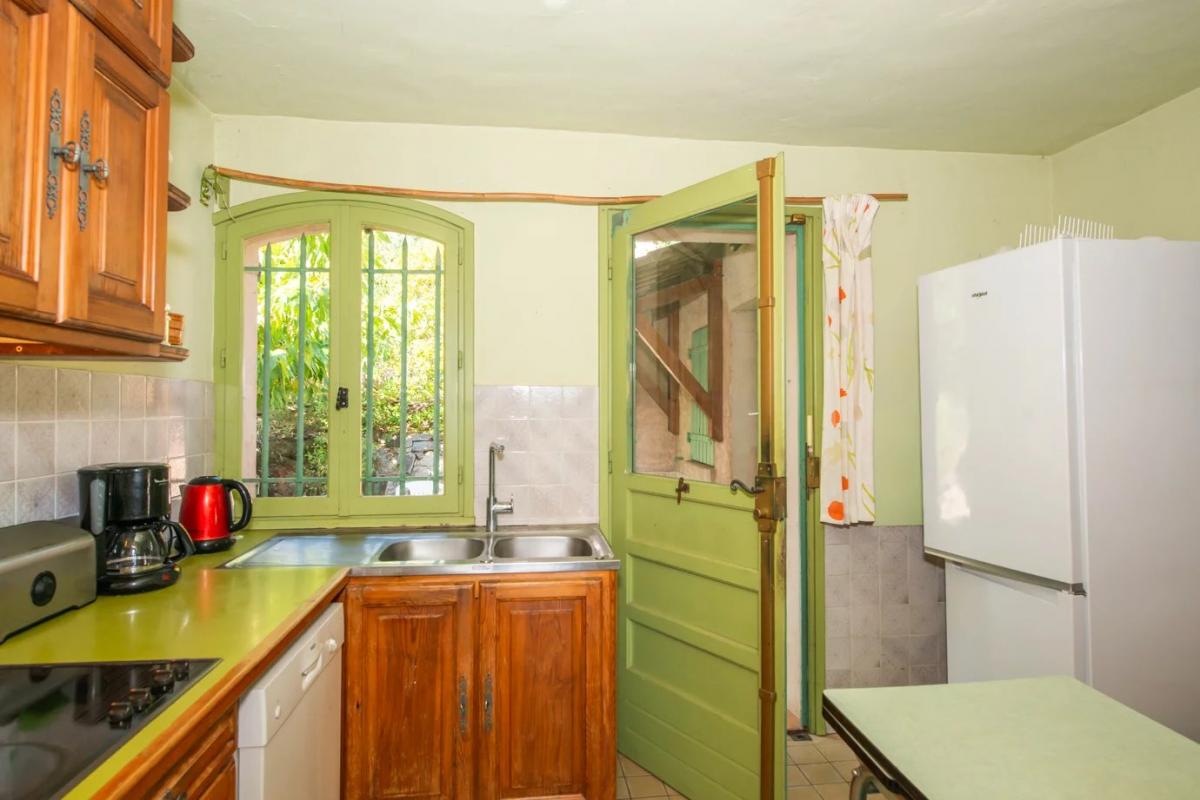 Entrance hall, guest toilet, living room with fireplace and access to veranda (large windows) - sea views. Fitted kitchen. 2 bedrooms, dressing room, bathroom. Large terrace overlooking the Gulf; garden with mature trees, including oak, palm and olive trees.