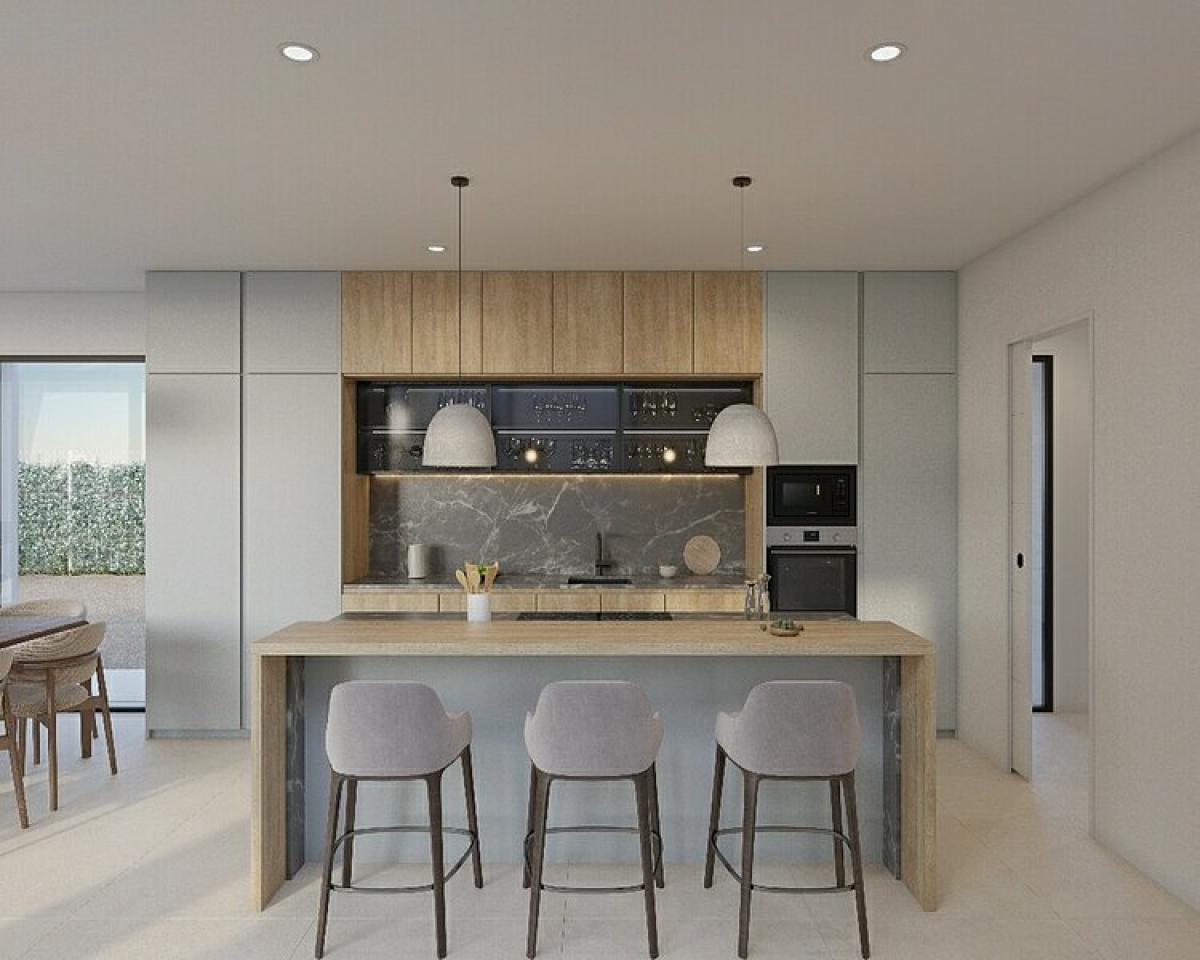 These stunning detached villas offer 3 bedrooms, 2 bathrooms and toilet. A fully fitted and equipped kitchen. Air conditioning. Walk in mastersuite closet. Landscaped gardens. Private garage. Plots from 720m2.