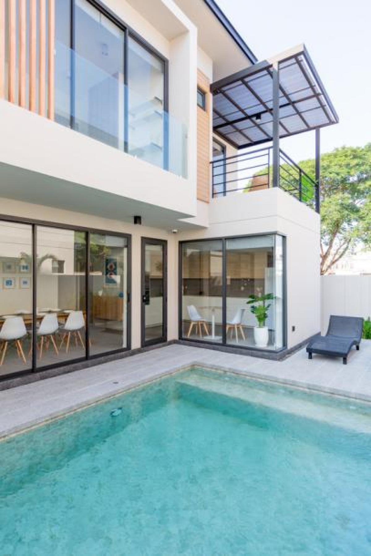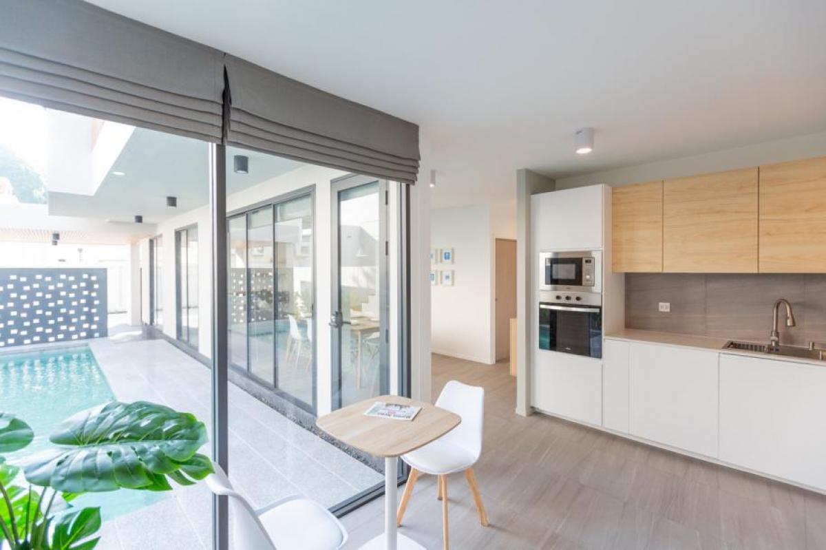 These villas are meticulously crafted to provide a tranquil retreat. Each home features a spacious 8x4 meter salt-chlorinated swimming pool surrounded by an ample decking area, ensuring the ultimate in relaxation and privacy. The interiors boast an open-plan layout with a modern western-style kitchen fully equipped with high-quality appliances, including a dishwasher, built-in oven, and microwave. A separate Thai kitchen/washroom adds extra functionality.