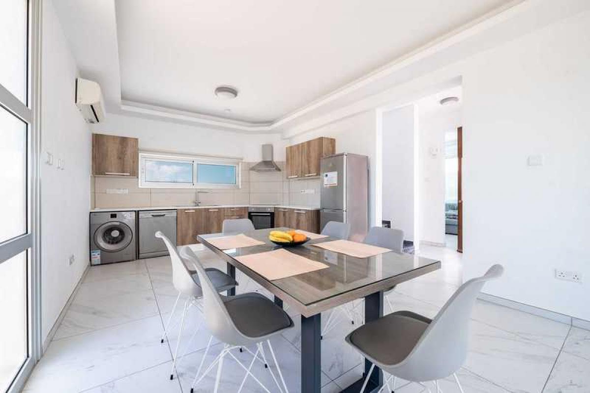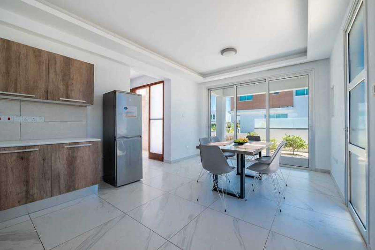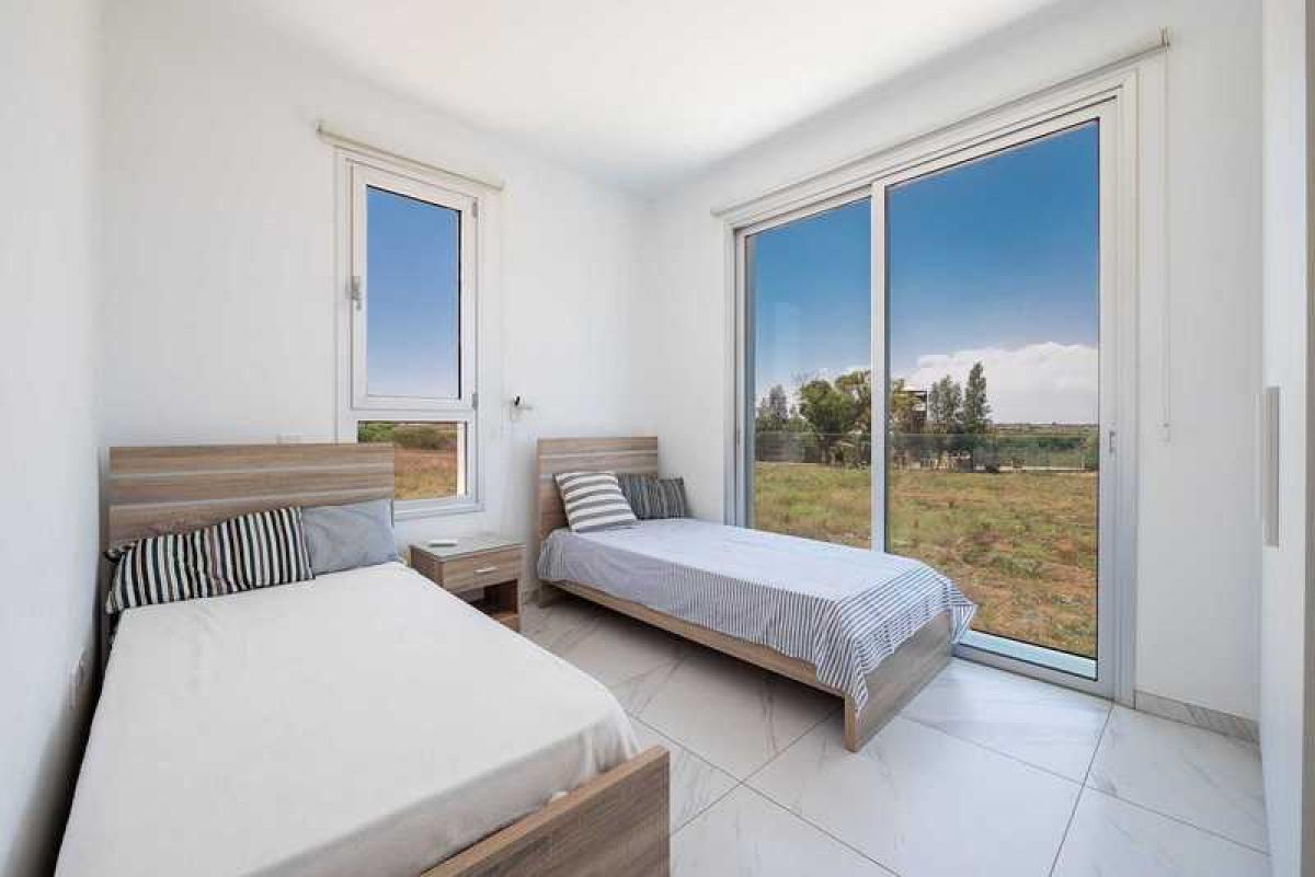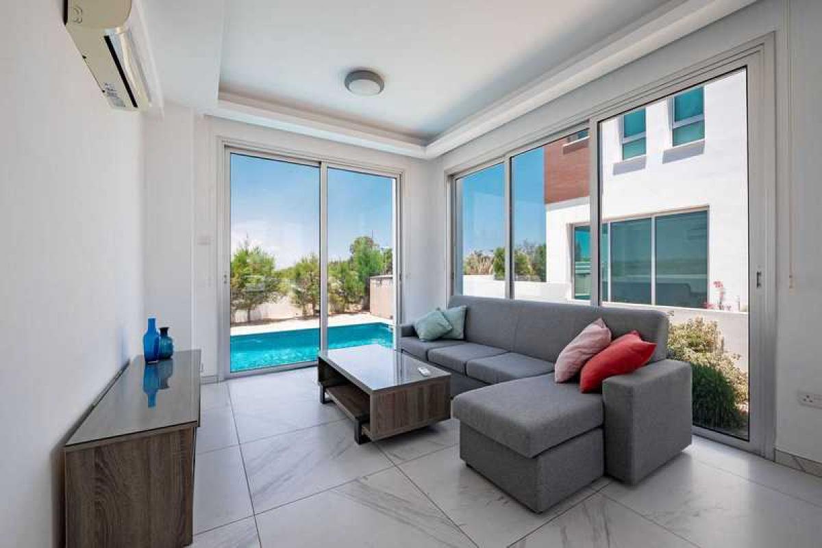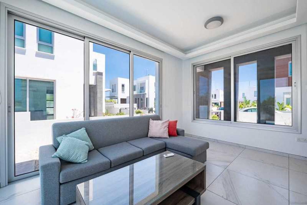 The villa is a part of an amazing gated complex of 19 modern villas. It is located in Kapparis - one of the most popular tourist destinations of Famagusta area in the East of Cyprus. The clear blue waters of the Mediterranean await you!The cozy 3 bedroom villa with private swimming pool and garden offers relaxing and tranquil time with family or friends. Modern design and comfort of open plan ground floor with kitchen, dining area and living room allow enjoying time. The living area has 2 coaches, a coffee table and tv stand while the dining area features a dining table and chairs. The modern kitchen is equipped with all the appliances: fridge, dishwashing machine, oven, electrical hob and hood, washing machine etc, and will be a joy to cook in. There is a guest toilet on the ground floor. The three furnished cozy bedrooms are tucked away on the first floor: master bedroom with en-suite, two bedrooms and one family bathroom.