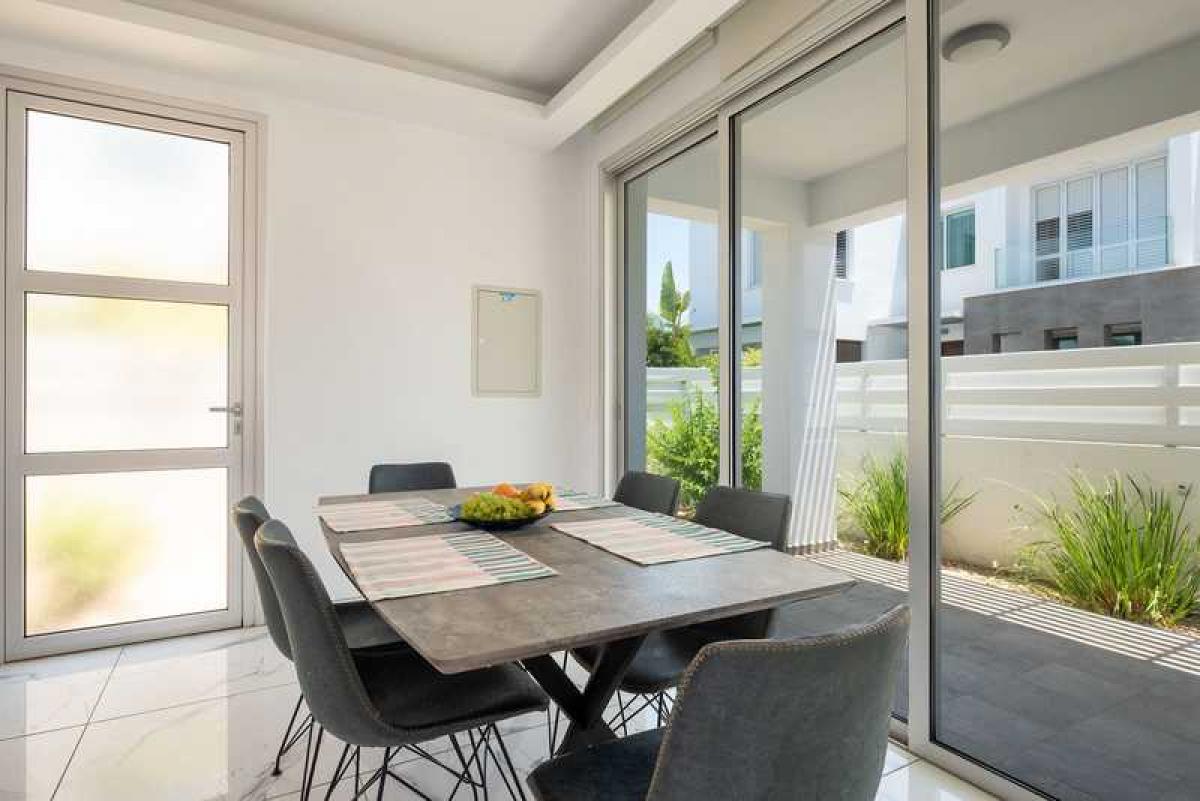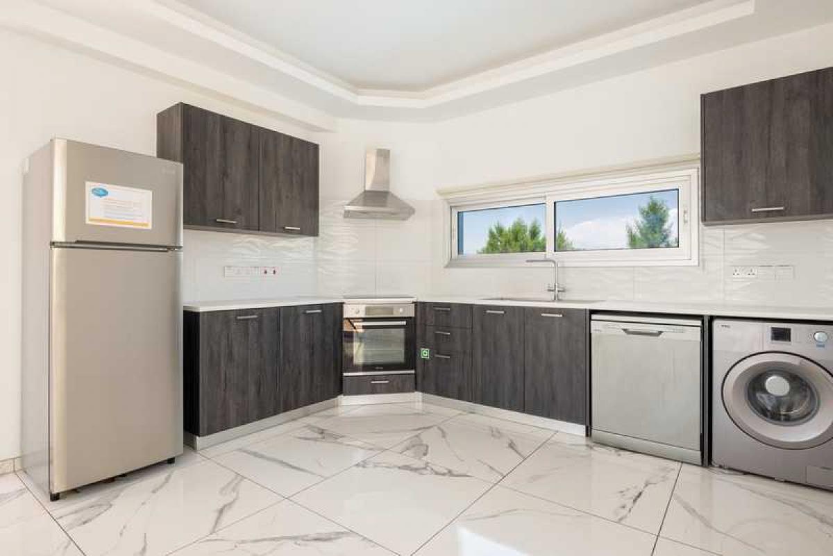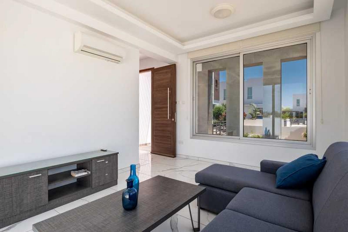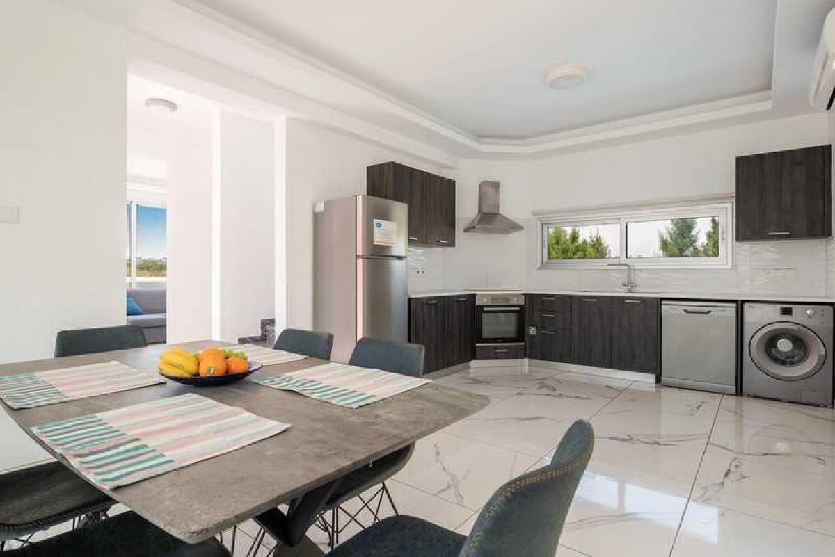 The villa is a part of an amazing gated complex of 19 modern villas. It is located in Kapparis - one of the most popular tourist destinations of Famagusta area in the East of Cyprus. The clear blue waters of the Mediterranean await you!The cozy 3 bedroom villa with private swimming pool and garden offers relaxing and tranquil time with family or friends. Modern design and comfort of open plan ground floor with kitchen, dining area and living room allow enjoying time. The living area has 2 coaches, a coffee table and tv stand while the dining area features a dining table and chairs. The modern kitchen is equipped with all the appliances: fridge, dishwashing machine, oven, electrical hob and hood, washing machine etc, and will be a joy to cook in. There is a guest toilet on the ground floor. The three furnished cozy bedrooms are tucked away on the first floor: master bedroom with en-suite, two bedrooms and one family bathroom.