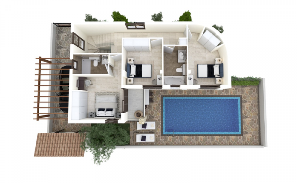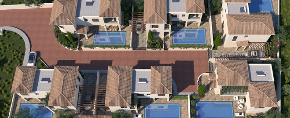 The construction will be of reinforced concrete frame, thermally insulated brick walls and flat reinforced concrete thermally insulated roof with an additional timber frame sloping tiled roof over.Generally, the ground floor of each house will consist of an entrance hall, a sitting area, and an open plan kitchen with a dining area, a guest WC, a store room, a pump room and an internal stairway leading to the first floor. The first floor in general will consist of three bedrooms (one of which with an en-suite bathroom) a common bathroom and verandas.