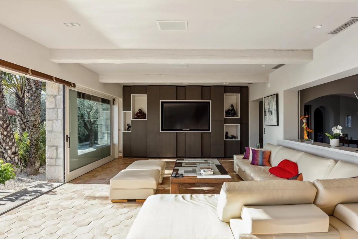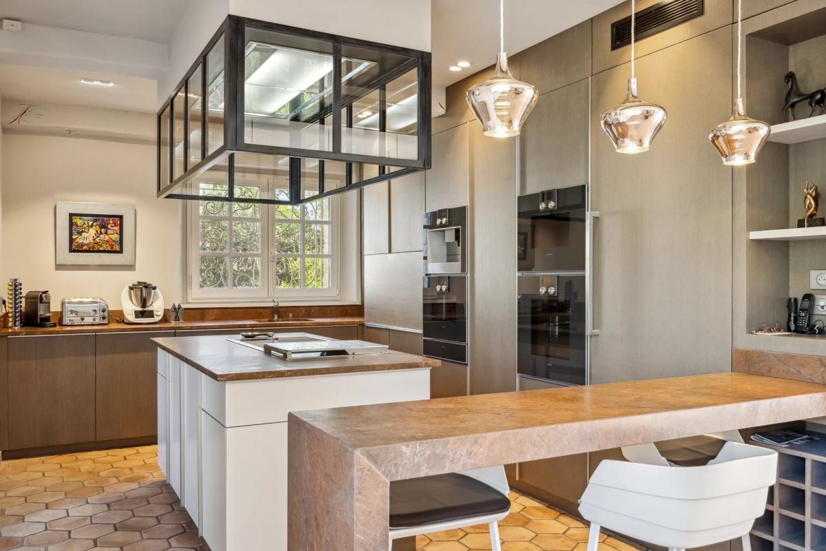 inside, everything has been designed for comfort and elegance. The spacious 100 m2 living room, bathed in light thanks to large bay windows, opens onto vast terraces surrounding a beautiful heated infinity pool. The kitchen, equipped with top-of-the-range Gaggenau appliances, offers a modular space perfectly suited to receptions: open for convivial moments or closed for greater intimacy.