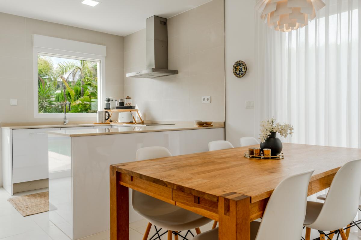 This stylish villa is designed with a modern contemporary aesthetic and a perfect family-friendly touch. The spacious open-plan living and dining area is bathed in natural light, with floor-to-ceiling patio doors that lead to an outdoor seating area overlooking the stunning 5m x 10m private pool. The high-specification kitchen is fully equipped with the finest appliances and includes a breakfast bar, making it a functional yet elegant space for everyday living and entertaining.