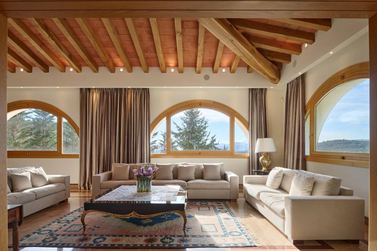 The main residence (616 m2) impresses with its grand entrance hall featuring a cathedral ceiling, a bright triple-aspect living room, a formal dining room, a private study, and four elegant suites, all served by an elevator.