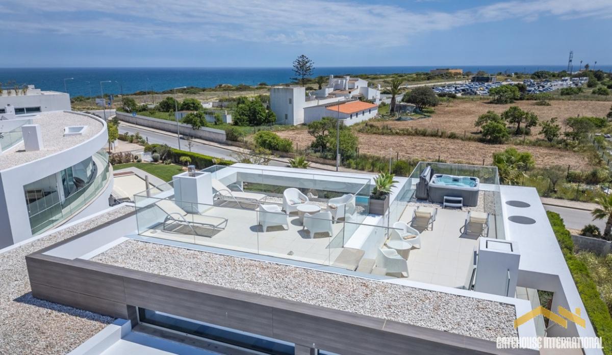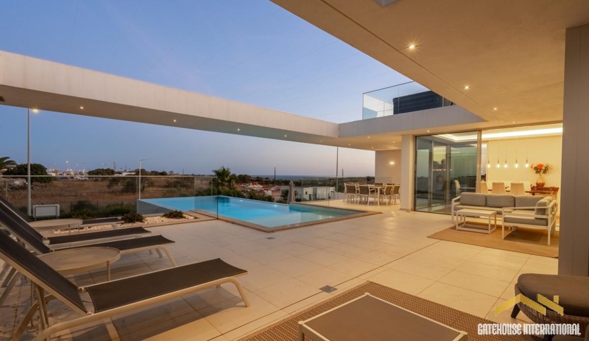 Sea View Contemporary Villa in Lagos West Algarve - A luxurious detached villa set on a 1175m2 plot located within walking distance from several beaches and the historic town centre. This modern property consists of the first floor with a spacious, double-height open-plan living room with a fitted kitchen and a dining area, a cloakroom, 2 bedrooms and 2 bathrooms (all ensuite) and the lower floor offering a large garage, a flexible room with a private shower room (ideal as a guest bedroom), a laundry area and a technical room. Outside, there is a raised, heated infinity swimming pool, a roof terrace ideal for sunbathing or enjoying the sunset from the Jacuzzi hot tub, as well as other terraces, BBQ and Al fresco dining areas, a covered parking area for 3 cars and gardens. in brief: - living and dining rooms - fitted kitchen - cloakroom - 2 bedrooms - 2 bathrooms - a guest bedroom with a private shower room - garage and carport - laundry room - infinity heated swimming pool - roof terrace with a Jacuzzi - terraces - BBQ and Al fresco dining areas - gardens Lagos is one of the most sought-after cities in the Algarve, not only for its golden sandy beaches and crystalline waters but also for the scenic beauty of its bay and its architectural legacy. Start your walk on Avenida dos Descobrimentos, the beautiful waterfront along the mouth of the Ribeira de Bensafrim, which will take you to some of the points of interest in Lagos that are well worth a visit. There is also the Marina, where you can take a ferry/boat and see Ponta da Piedade, which is one of the most beautiful coastal landscapes in the Algarve. A set of wonderful cliffs, caves and arches, rocks that seem to have been carved by hand and small coves and beaches, bordered by a sea of turquoise and emerald tones. Lagos is close to all amenities, public transport, shops, schools, etc. and is situated within a 1-hour drive from Faro international Airport.