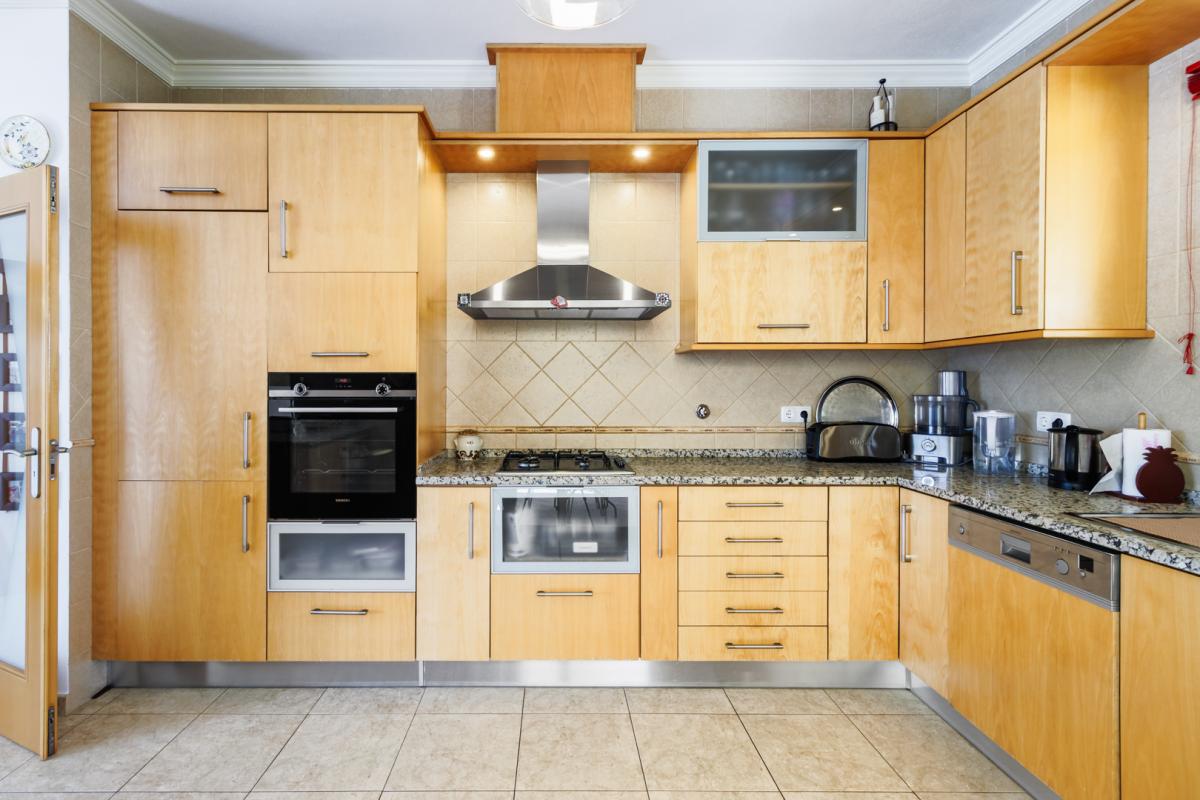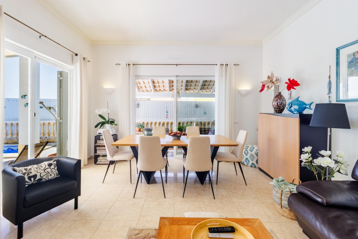 From the hallway, you also access the fully equipped kitchen, which is complemented by a generous dining area, both offering direct access to the outdoor poolside.