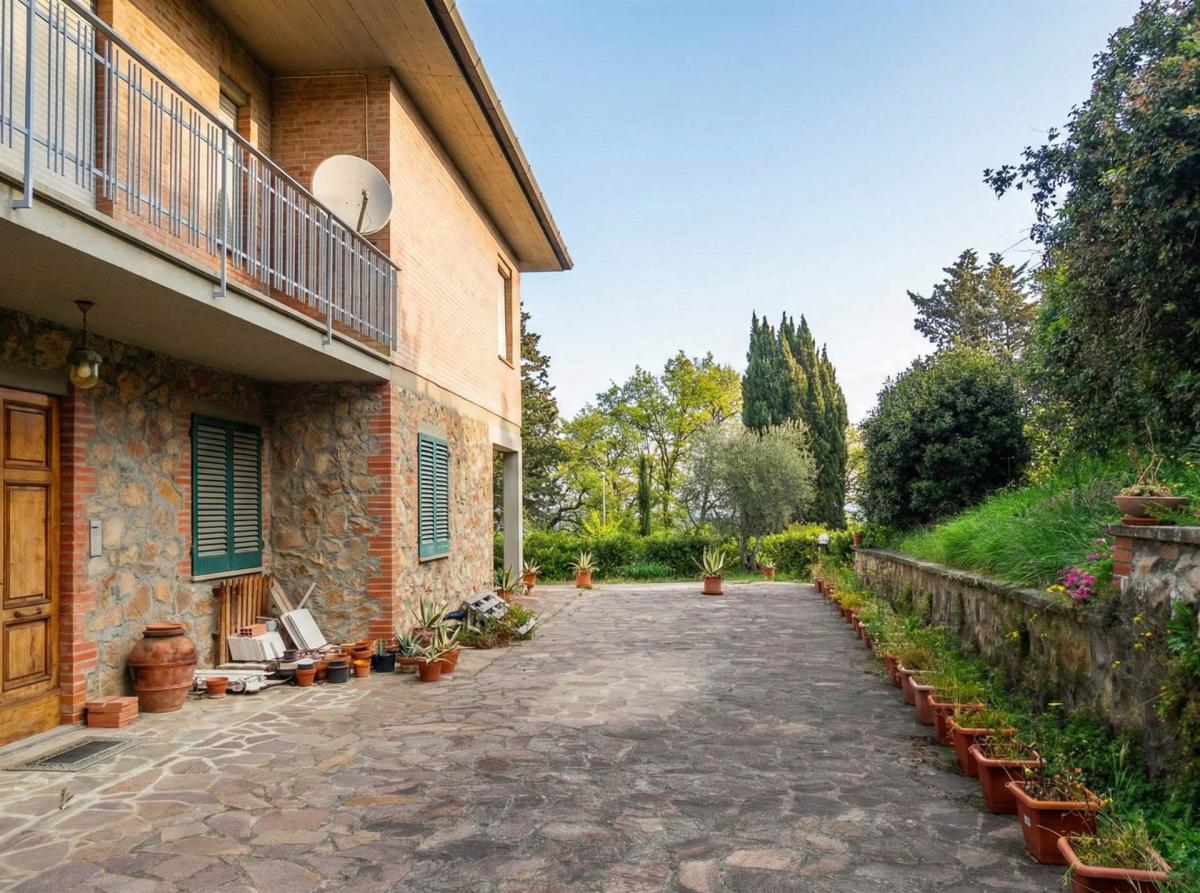 The villa is nestled in a private park of over 5,000 sqm, an oasis of absolute peace and privacy in the heart of the Tuscan countryside. The property boasts two splendid covered, livable terraces on the first floor, perfect for enjoying the views of the greenery in any season. The vast garden offers a perfect area for the future construction of a swimming pool. A significant added value is the presence of residual building volume, allowing for further development or expansion of the property. The location ensures total silence and tranquility, while remaining close to the village of Lajatico and the famous Teatro del Silenzio.