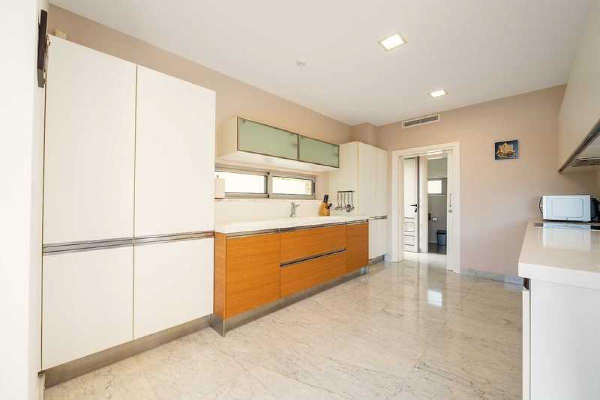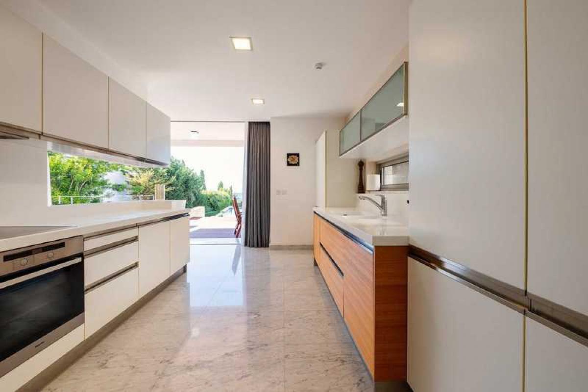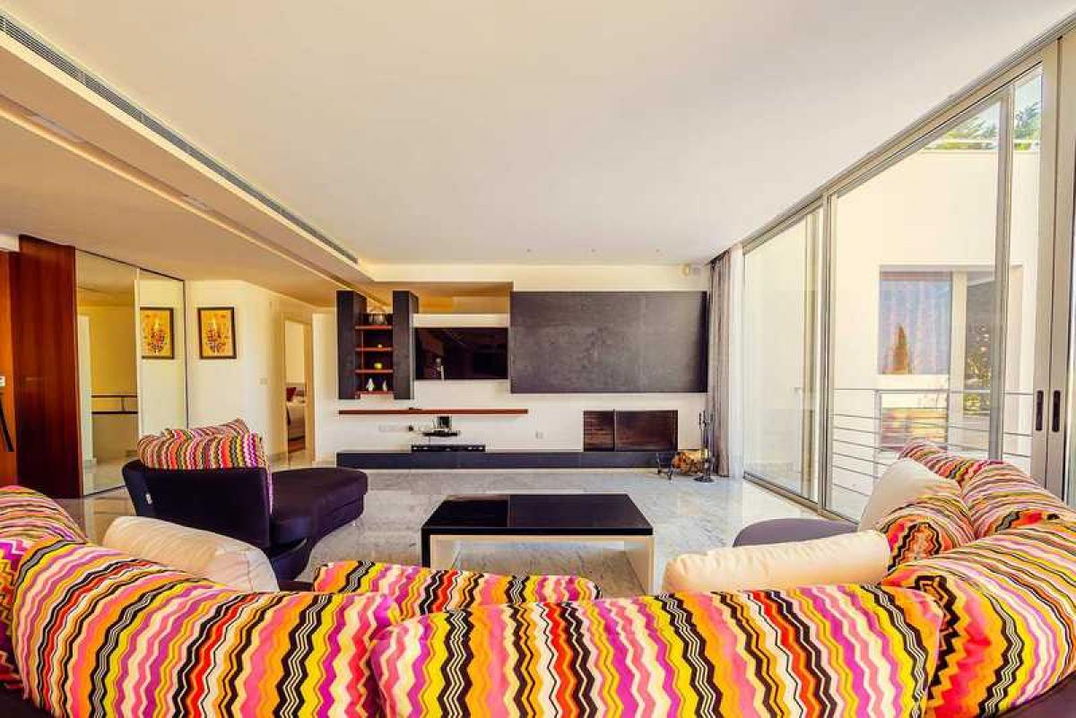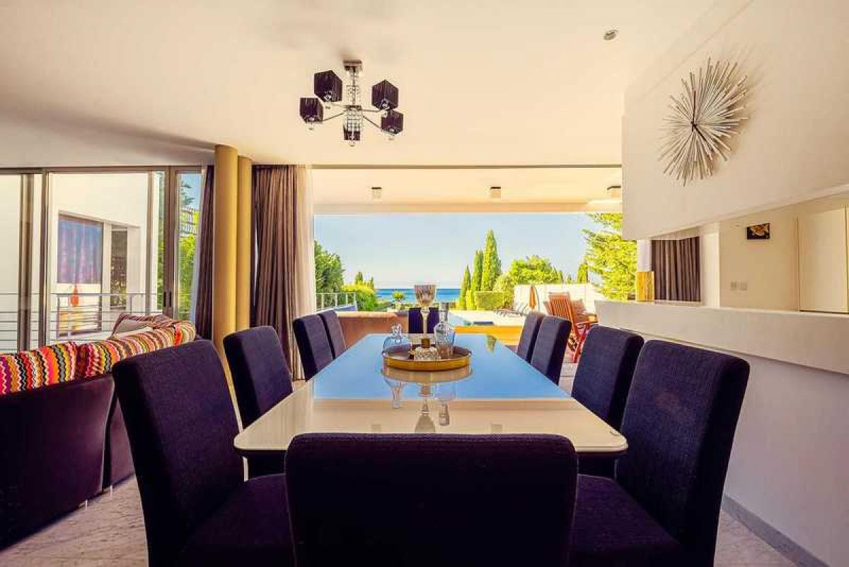 This amazing villa is located on the first line to the sea in a gated community in the area of Latchi, Polis, in the western part of Cyprus. The villa has its own private beach, which creates a special atmosphere of peace and luxury. On an area of 425 sq.m. there are 5 spacious bedrooms, 5 bathrooms, one of which has a SPA area, 5 balconies and living areas.The villa has two main entrances on different levels. On the upper level there is a guest toilet, a large fully equipped kitchen and a main living room with a fireplace, as well as 2 en-suite bedrooms. From the main living room you enter a magnificent furnished terrace with endless sea views. The second living room, equipped with a home cinema, is located on the lower level. There are also 2 more bedrooms and 2 bathrooms, a sauna room, a kitchen, utility rooms, a staff lunch room. The master bedroom with a SPA area and access to a spacious terrace is located on the third floor. The floors in the living rooms and kitchen are made of marble, in the bedrooms - wood parquet