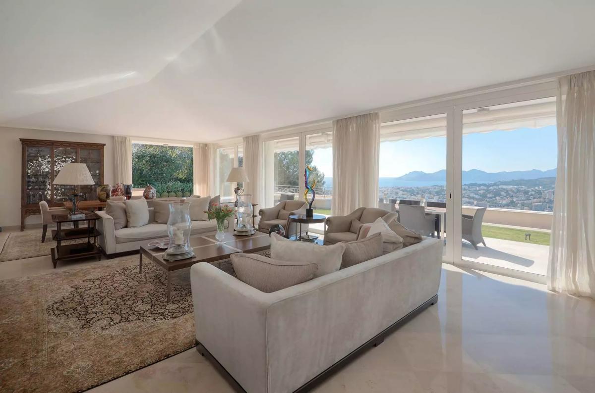 Diese elegante, zeitgenossische Villa liegt ideal in einer vertraulichen Privatdomane, die aus nur funf Anwesen besteht. Sie uberragt die Reede von Cannes und bietet einen atemberaubenden Blick auf das Esterel-Massiv.