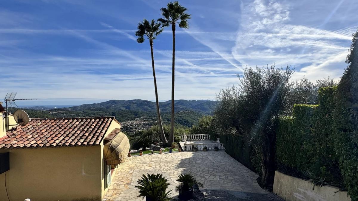 This charming Provencal villa enjoys a breathtaking panoramic view — in the foreground, the rolling hills of the hinterland, and beyond, the sea with the Lerins islands on the horizon.
